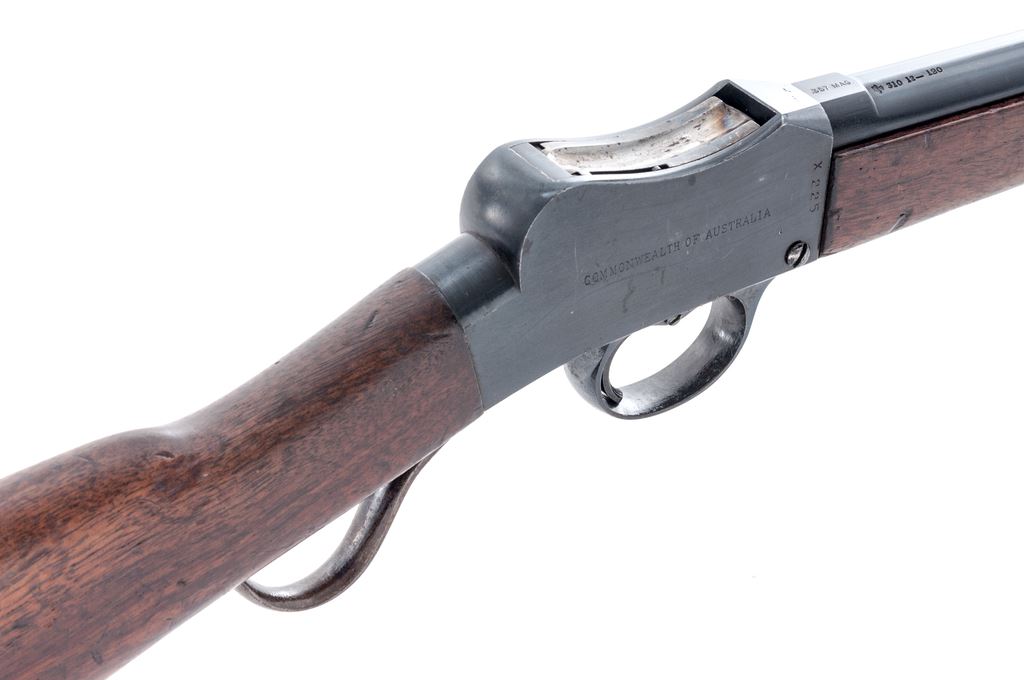 Australian BSA Cadet Martini Single Shot Rifle, #X225, .357 mag. cal., 25.2'' barrel, blued finish, hardwood stock, blade front sight and adjustable leaf rear sight. Marked on right side of receiver ''COMMONWEALTH OF AUSTRALIA'', and on left side ''MADE BY THE BIRMINGHAM SMALL ARMS CO LTD''. Very sharp ''COMMONWEALTH OF AUSTRALIA MILITARY FORCES VICTORIA cartouche on right side of buttstock. #15351 also stamped on buttstock. Condition overall is very good with approx. 95% finish remaining on the metal. Wood is good with darkening and overall handling marks. Action is smooth, bright bore is very good. No visible import stamps. Est.: $500-$700. (C&R)