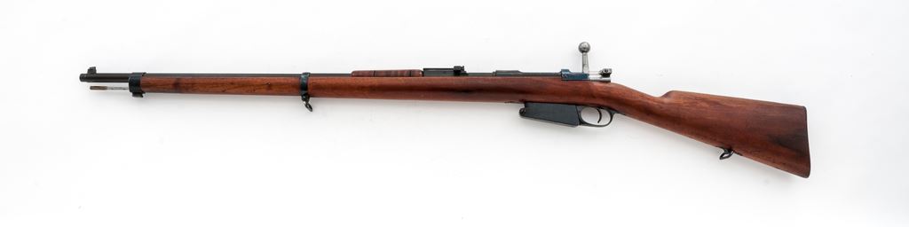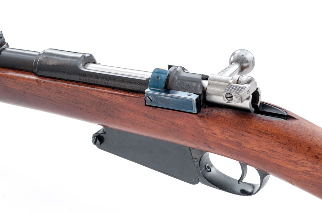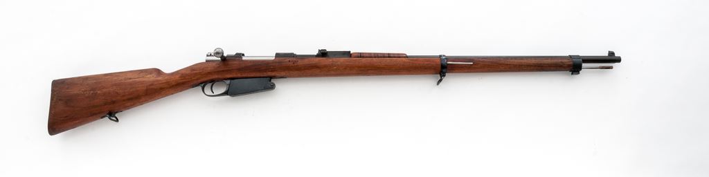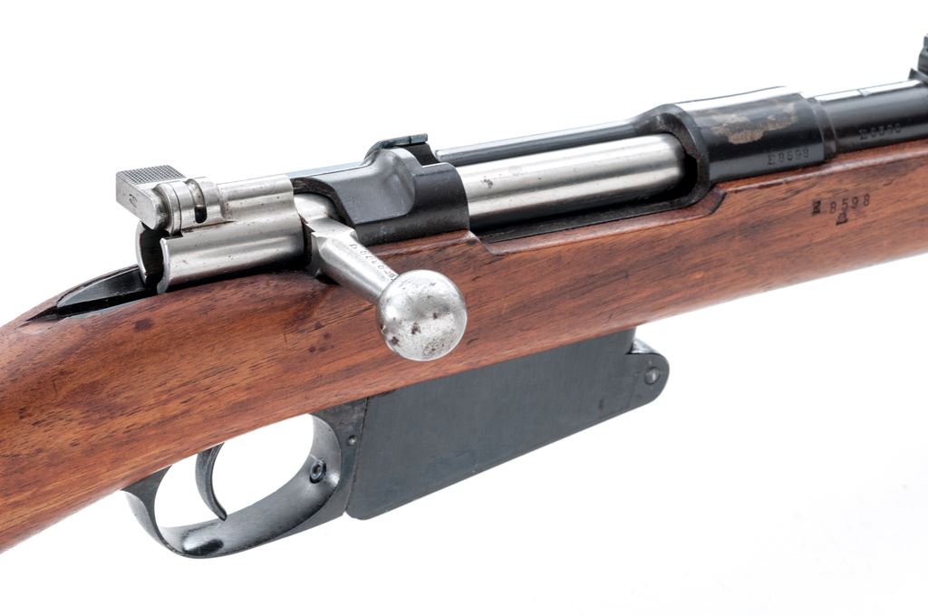 Argentine Model 1891 Mauser Bolt Action Rifle, #E8598, 7.65x53mm cal., 29.13'' barrel, blued/bright finish, hardwood stock, inverted ''V'' front sight and adjustable folding leaf rear sight. Marked on left side of receiver ''MAUSER MODELO ARGENTINO 1891 MANUFACTURA LOEWE BERLIN''. Argentine cartouches on buttstock and handguard, with matching numbers. Crest has been ground off of receiver ring and the area refinished with a mottled bluing. Condition overall is very good with approx. 85% finish remaining on the metal which is slightly browning overall, with rust on the buttplate. Wood shows an old light refinish that is now faded with dents and scratches. There are sharp cartouches on the buttstock. Action is smooth, bright bore is excellent. No visible import stamps. Est.: $300-$500. (Antique)