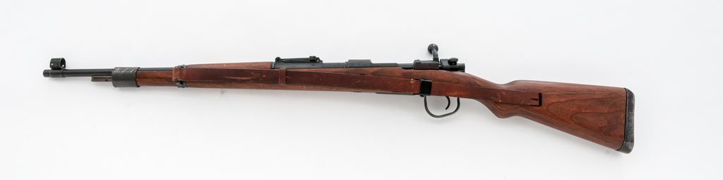 Czech K98 Mauser Bolt Action Rifle, #6194, 8x57mm cal., 23.6'' barrel, blued finish, laminated stock with cupped buttplate, inverted ''V'' front sight and adjustable tangent rear sight, no cleaning rod. Czech crest has been removed from top of receiver ring and marked ''CESKOSLOVENSKA ZBROJOVKA,A.S,BRNO''. Matching numbers except buttplate. Condition overall is very good+ with approx. 95% finish remaining on the partially reblued metal. Wood has been sanded and refinished and shows a few dents and scratches to the finish. Action is smooth, bright bore is excellent. No visible import marks. Includes a reproduction leather sling in very good condition. Est.: $500-$750. (C&R)