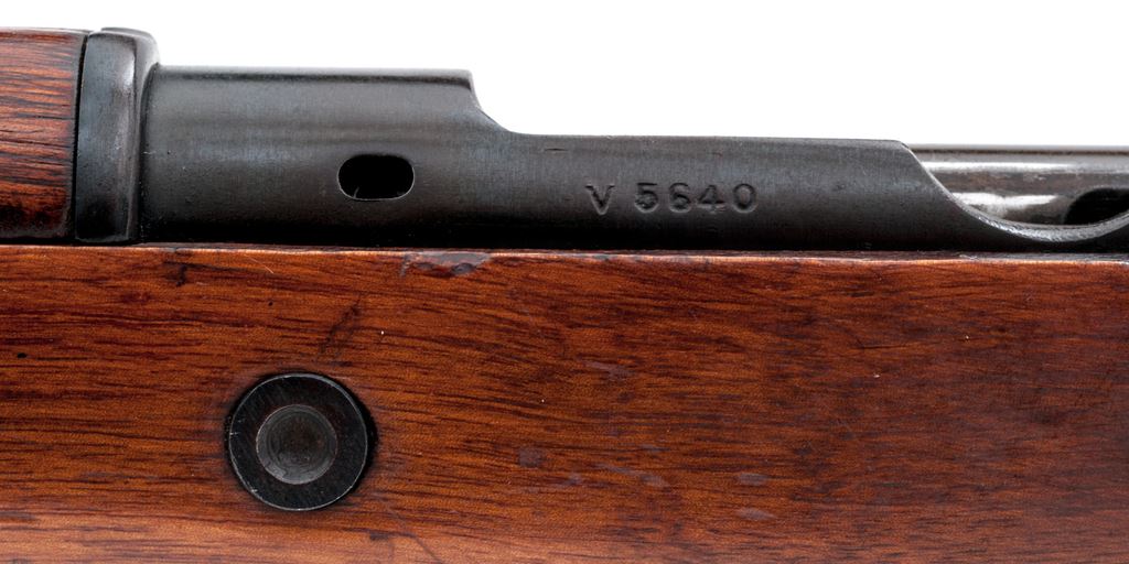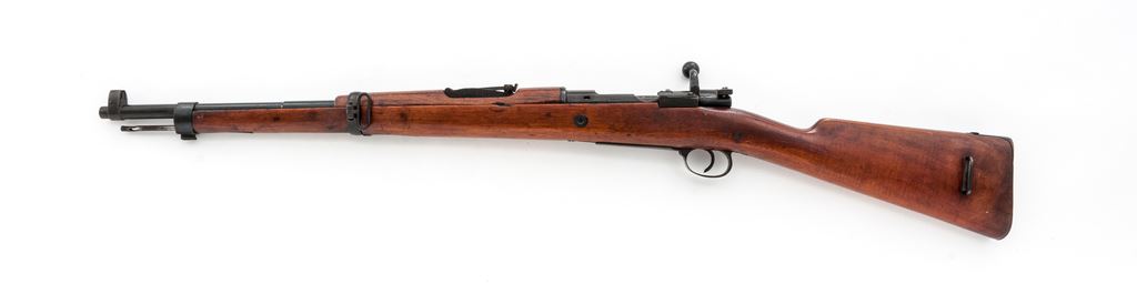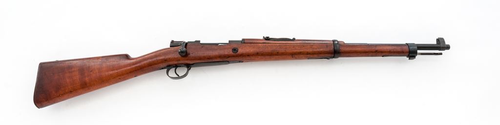 Spanish Model 1916 Mauser Bolt Action Rifle, #V5640, 7x57mm cal., 21.5'' barrel, blued finish, hardwood stock, inverted ''V'' front sight and adjustable tangent rear sight. No markings on receiver ring or stock. Mismatched number on bolt handle. Includes cleaning rod that is bent at tip. Condition overall is very good with the metal retaining approx. 85% of its refinished bluing. Wood has been sanded and refinished over old dents and scratches; there is a small crack at the wrist. Bore is very good with very good rifling. The sear needs to be adjusted as the bolt drags on closing, otherwise the action operates smoothly. No visible import marks. Est.: $250-$350. (C&R)