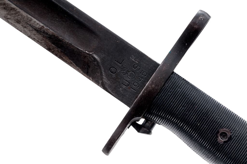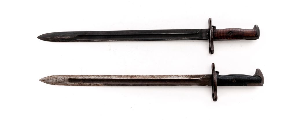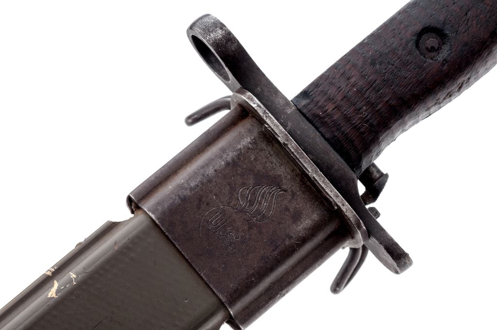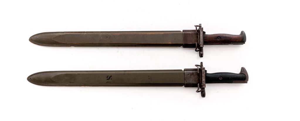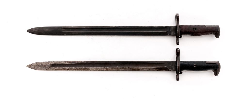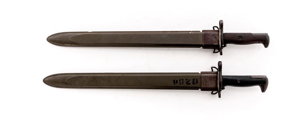 Lot of two (2) U.S. Bayonets: 1.) U.S.M-1942 marked ''OL US 1942'' on ricasso, 15.75'' blade. Condition of bayonet is good with approx. 40% finish remaining on the blade with overall patina. Sharpening to blade and nicks to blade and back edge. Grips are very good. Green plastic scabbard marked ''USN MKI''. Condition is good with handling marks and patina. 2.) U.S.M-1905 marked ''US'' and ''SA/(flaming bomb)/1920'', 16'' blade. Condition of bayonet is very good with approx. 90% finish remaining with light patina to the pommel. Blade with old sharpening. Wooden grips very good with minor flattening. Scabbard is good with chips and scratches. Est.: $150-$250/lot.