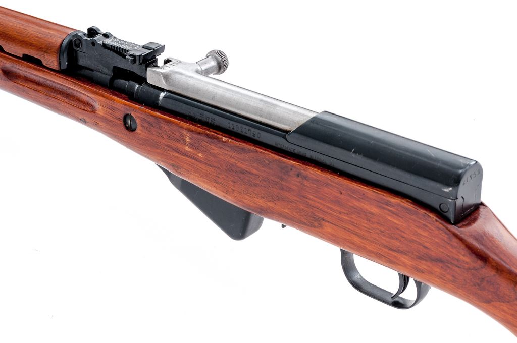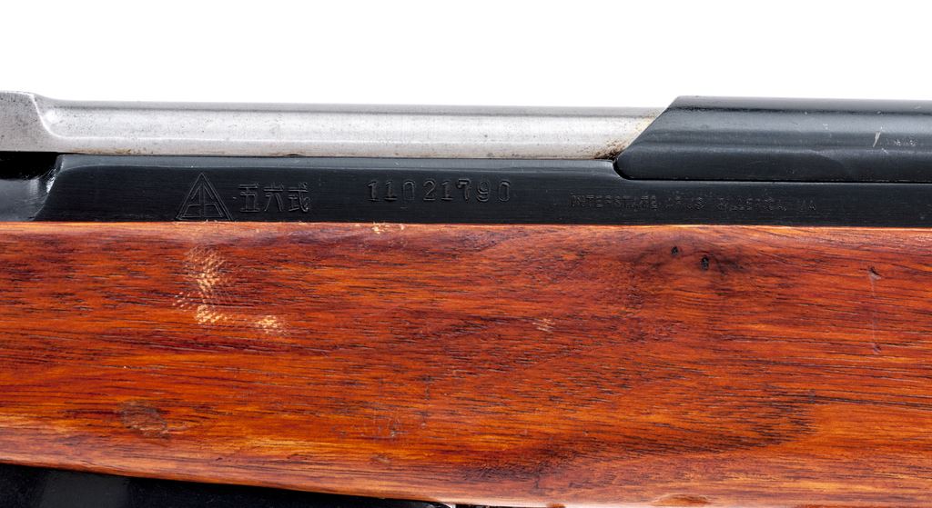 Chinese SKS Semi-Automatic Carbine, with folding bayonet, #11021790, 7.62x39mm cal., 20'' barrel, blued finish, hardwood stock, hooded post front sight and adjustable tangent rear sight. Marked on left side of receiver with a ''26/(triangle)'' stamp and three Chinese characters. Matching numbers, with cleaning rod and butt trap cleaning kit. Condition overall is very good with over 90% finish remaining on the metal, and scratches on the receiver, magazine and barrel. Wood is very good with overall scratches and dents in the finish. Action is smooth, bright bore is excellent with sharp rifling. Triangle bayonet is excellent. Import stamped on left side of receiver. Est.: $350-$450. (C&R)