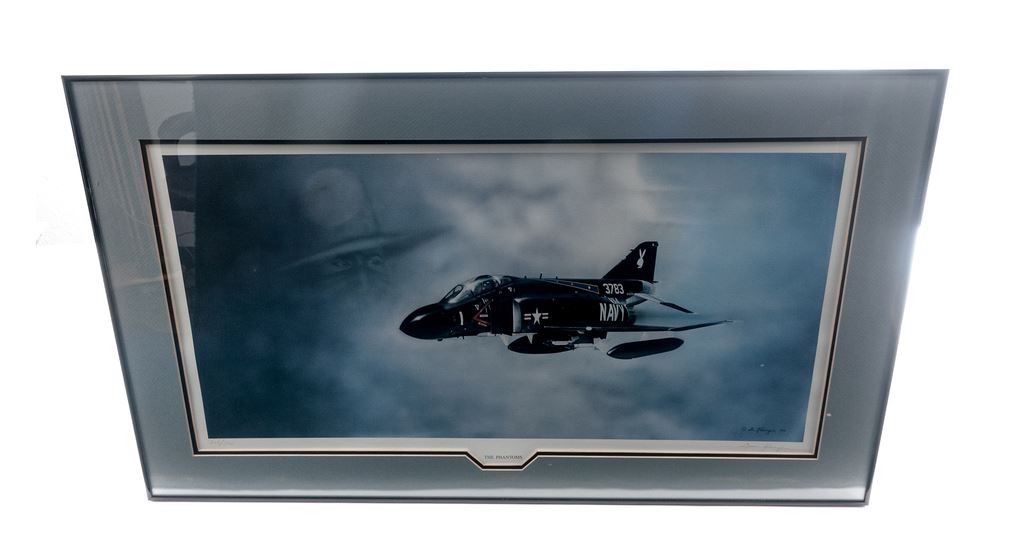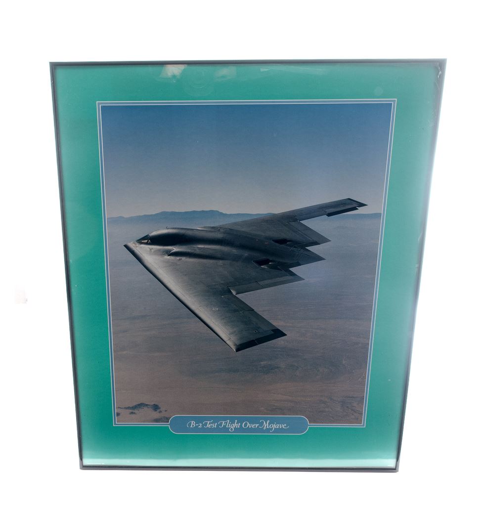 Lot of Two (2) Aviation Prints: (1) ''The Phantoms'', by D, Kissinger, approx. 17''x38'' framed and matted, and dated 1988. (2) ''B-2 Test Flight Over Mojave'', unsigned, published by the Northrup Corp., 1990, image size approx. 25''x20''. Both are in excellent condition under glass in metal frames, one with minor damage to corner of glass. Est.: $200-$300/lot.