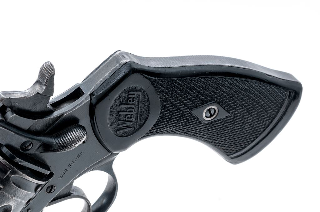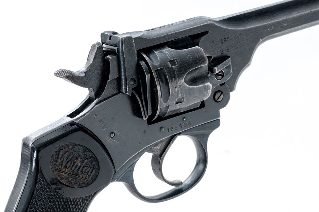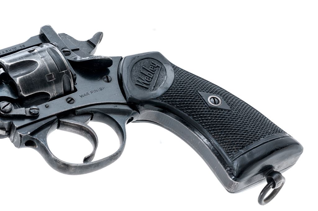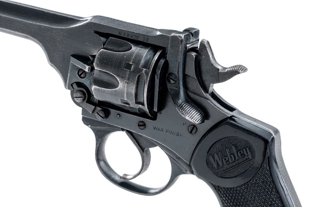 Webley Mark IV Double Action Revolver, #129598, .38 S&W cal., 5'' barrel, blued finish, black plastic grips with lanyard ring, blade front sight and notched rear sight. Marked on left side barrel strap ''MARK IV .38'', and on top ''WEBLEY & SCOTT LTD''. Left side frame marked ''WAR FINISH''. Both grips marked with ''WEBLEY'' logo. London export proof stamps on right side of barrel. Matching numbers. Condition overall is very good with approx. 95% finish remaining on the metal with light edgewear. Grips are very good with small chips and handling marks. Action is smooth and locks up tight; bore is bright with very good rifling, the chambers are clean and bright. No visible import marks. Est.: $350-$500. (C&R/PPT)