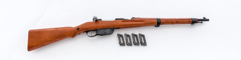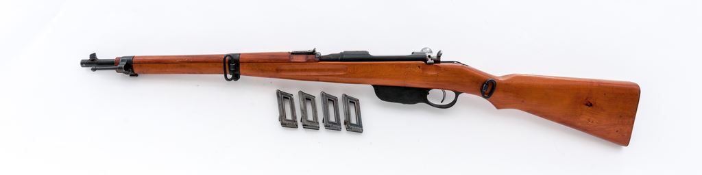 Austrian Model 95 Straight-Pull Carbine, #5611A, 8x56Rmm cal., 19.5'' barrel, blued finish, hardwood stock, inverted ''V'' front sight and folding leaf rear sight. Marked on top of receiver ring ''STEYR M.95''. Large ''S'' on barrel shank. All matching numbers except buttplate. Condition overall is very good with over 95% finish remaining on the metal. Wood is very good with added finish and light handling marks. Action is smooth, bore is very good with very good rifling. Import stamped on left side of barrel. Includes four (4) empty military charger clips. Est.: $200-$350. (C&R)