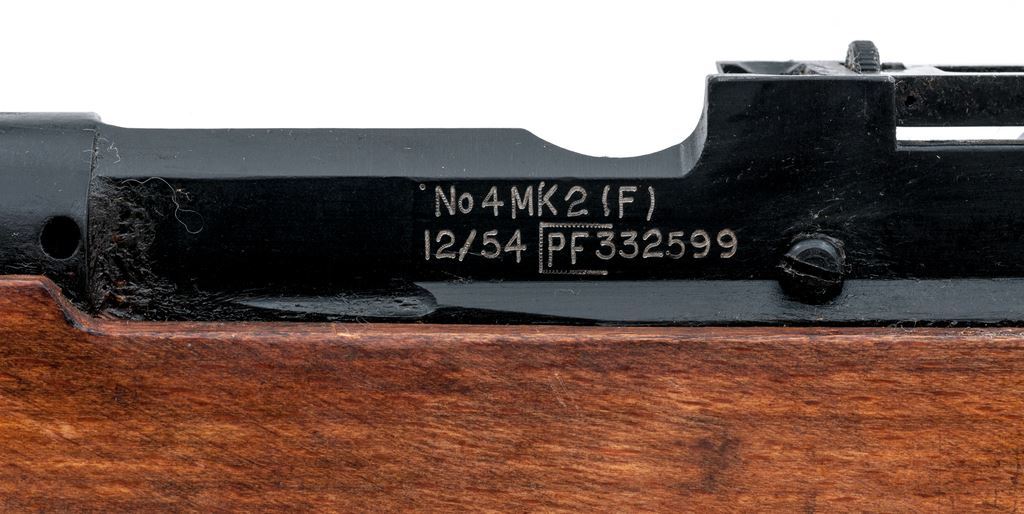 British No. 4 Mk 2 Lee-Enfield Bolt Action Rifle, #PF332599, .303 British cal., 25.2'' barrel, blackened finish, beech wood stock, blade front sight with protectors and adjustable folding leaf rear sight with aperture. Marked on left side of receiver ''No 4 Mk 2(F) 12/54''. Matching numbers, #1 bolt head. Condition is near excellent, with the rifle coated in its arsenal protective grease and the metal retaining almost all of its blackened finish. Wood is almost excellent but shows a number of recent bruises and scratches across its even colored finish. Action is smooth, bright bore is excellent with excellent rifling. Import stamped on right side of barrel. Est.: $350-$450. (C&R)