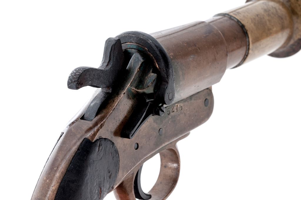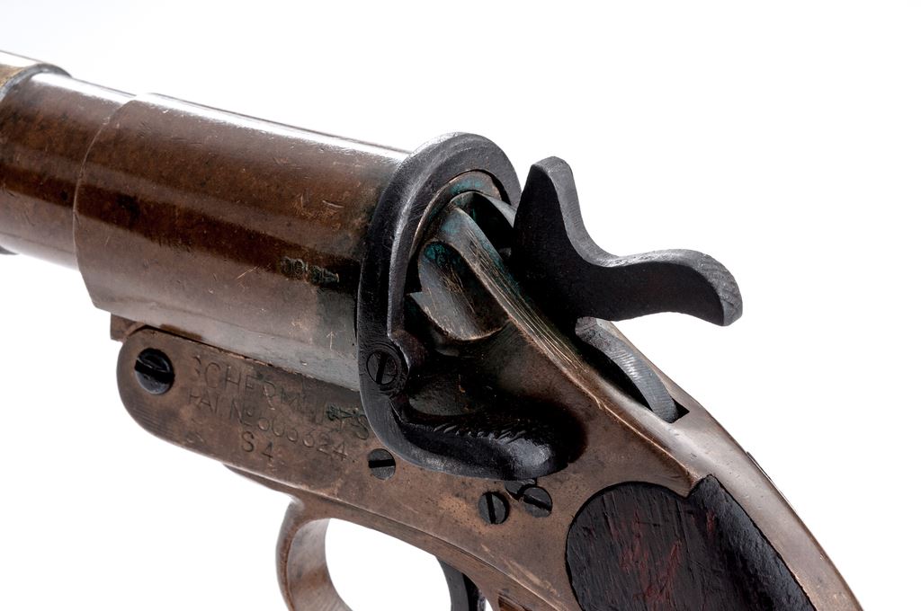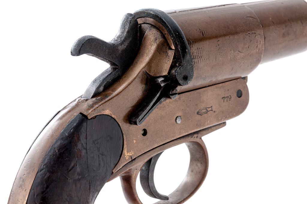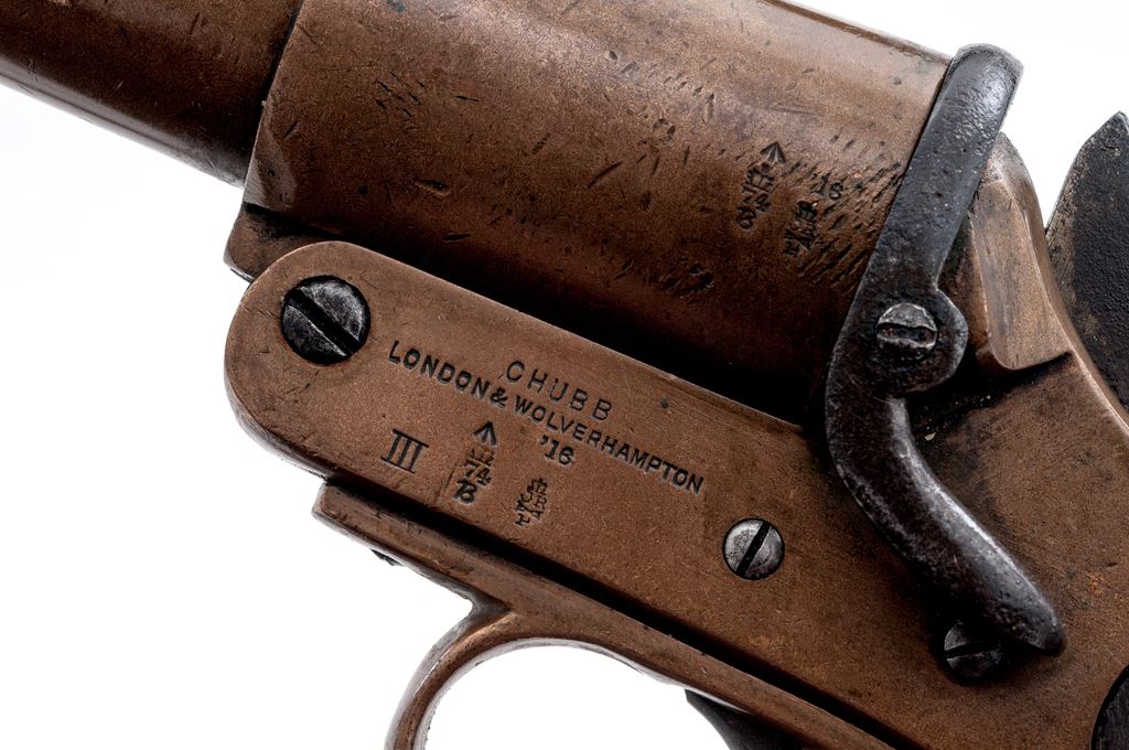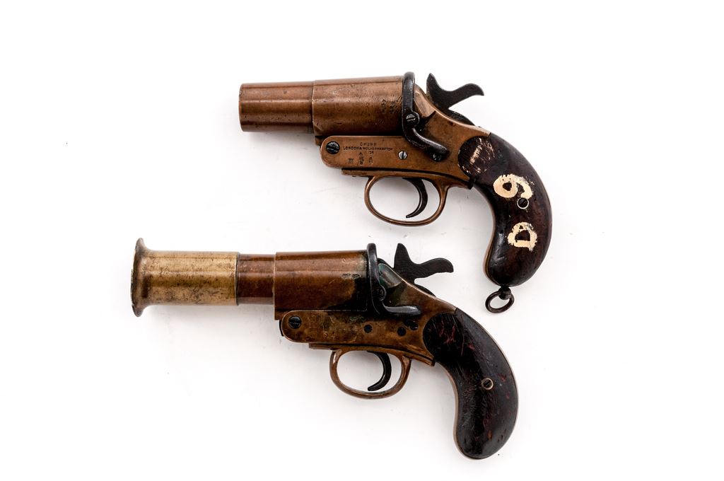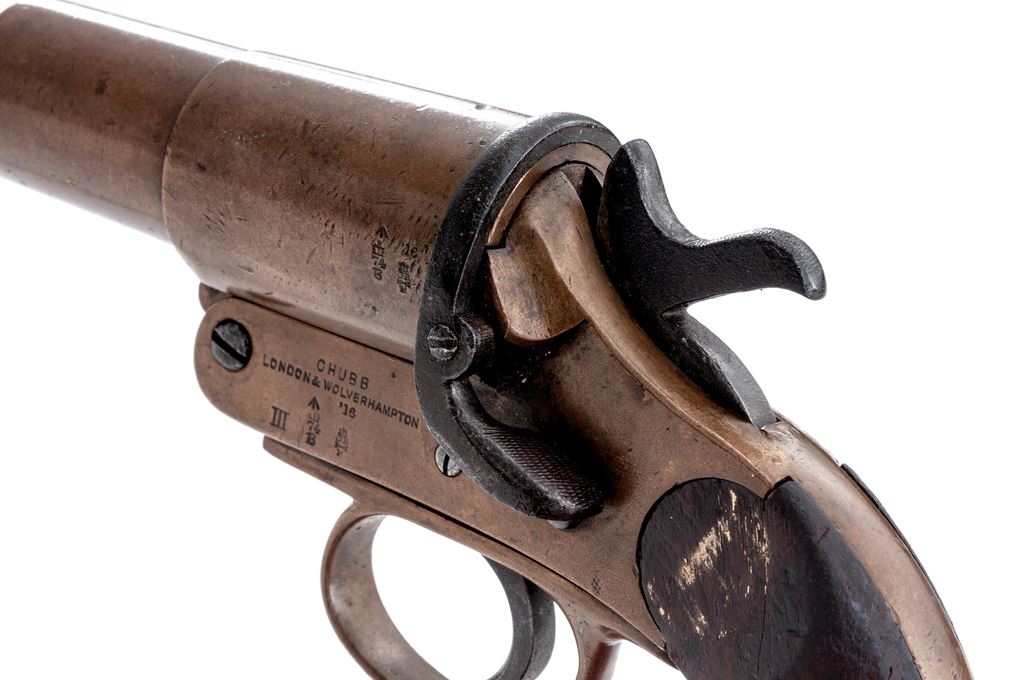Lot of Two (2) WWI Era Flare Pistols, by Chubb & Schermuly: 1.) Hard-to-Find Brass Flare Pistol by Chubb, London & Wolverhampton, dated 1916, #779, 25mm, 4-1/8'' barrel; left side of frame and barrel with broad arrow and misc. proofmarks; right side with Chubb, London, fish logo. Includes lanyard loop and smooth two-piece wood grips; left grip with ''D9'' in white paint. Extractor, barrel, and frame with matching numbers. Condition is very good. Brass with general shallow impressions and other small marks; factory lettering, proof marks, etc. are clear. Grips with oil darknening and handling marks, no chips or cracks. Good action and bore. 2.) Schermuly Brass Flare Pistol, #5275, 25mm, 6'' barrel; left side of frame is stamped ''SCHERMULY'S/PAT. NO503324/S4''; left side of barrel with London proofmarks. Smooth two-piece wood grips. Barrel and frame with matching numbers. Condition is good. Brass shows toning and some verdigris. Hammer, trigger, and latch are dark with some very fine pitting and mild rust spots. Grips shows age and wear consistent with the rest of the pistol, including oil darkening and handling marks. Good action and lightly pitted bore. Est.: $300-$400/lot.