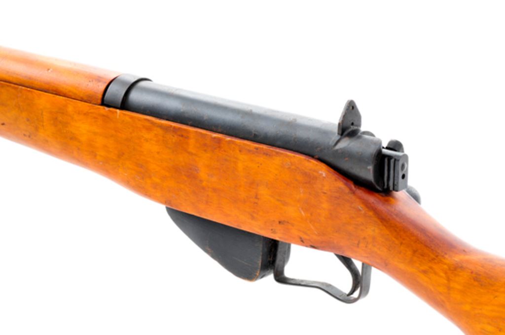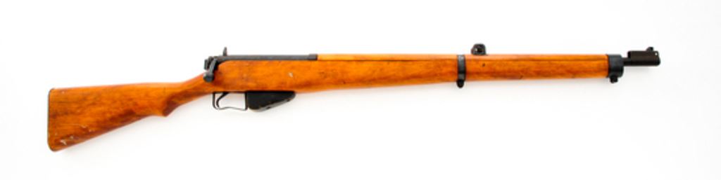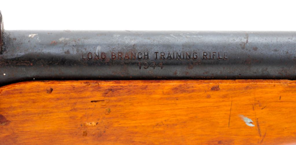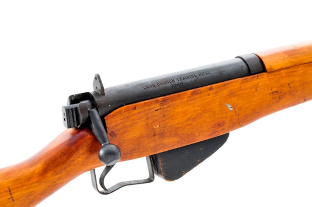 Canadian Long Branch Bolt Action Training Rifle, NVSN, a non-gun with training barrel fitted, blued finish, hardwood stock, blade front sight with protecting ears and peep fixed rear sight. Stamped on right side of receiver ''LONG BRANCH TRAINING RIFLE 1944'', and on pistol grip with ''(Broad Arrow)/C'' stamp. ''OL2271'' is stamped into underside of forend. Made to train WWII Canadian soldiers by replicating the weight and sight picture of the No.4 Lee-Enfield rifle. Condition overall is very good with approx. 60% finish remaining on metal parts which show an overall light brown patina. Wood shows scuffing and handling marks but is very good overall. Metal triggerguard is slightly bent. Two holes have been drilled in the butt forward of the toe. Rifle has been modified by removing the two small target spikes at the muzzle and the spring on the buttplate. Receiver and barrel group are loose in stock. Action is smooth. Est.: $200-$350. (No FFL Required)