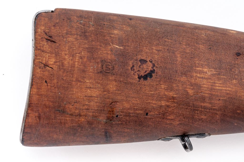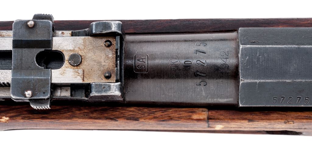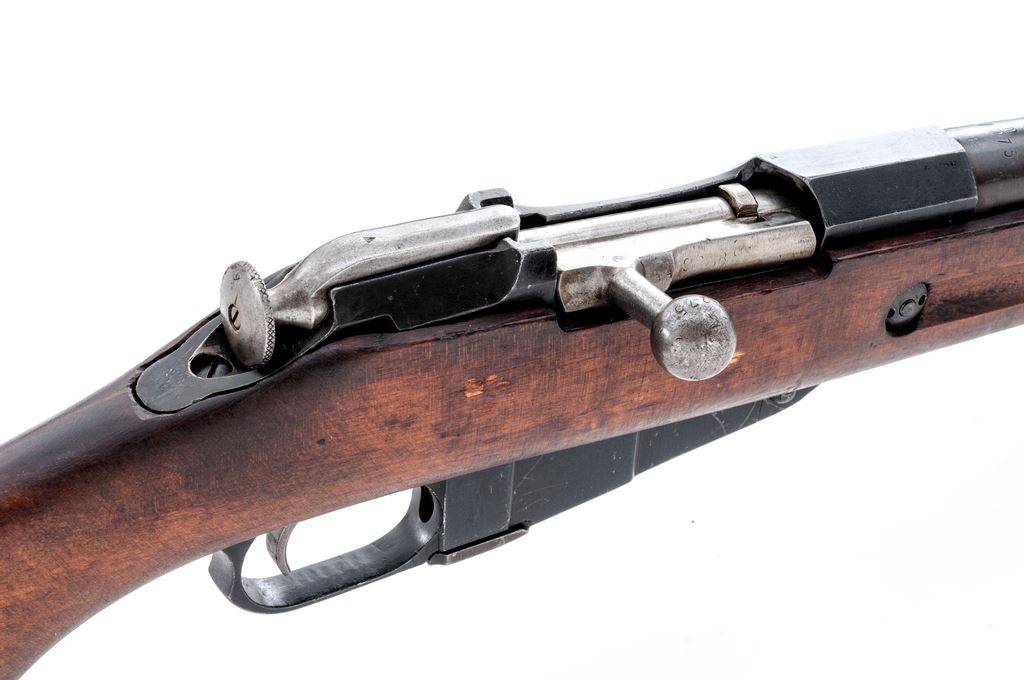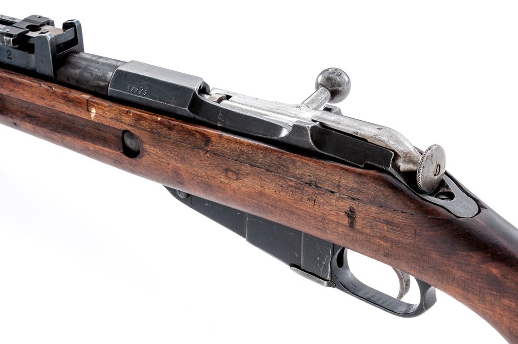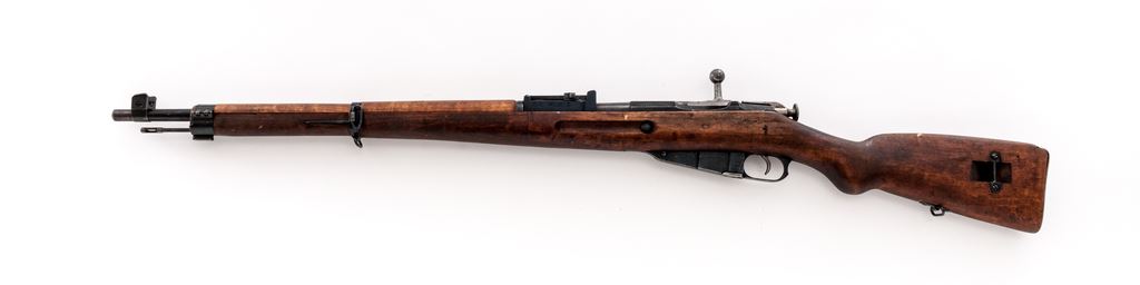 Finnish Model 39 Mosin-Nagant Bolt Action Rifle, #57275, 7.62x54R cal., 27'' barrel, blued finish, birchwood stock, blade front sight with protecting ears and adjustable folding leaf rear sight. Marked on receiver ''VKT'' over ''1942''. Also stamped with an ''SA'' property mark over ''D''. ''S'', and Sako gearwheel stamps on right side of buttstock. Bolt has been arsenal renumbered to match. Includes cleaning rod. Arsenal repair to left side of stock. Condition overall is very good with approx. 85% finish remaining on the metal with light patina on the bright buttplate. Wood is very good with darkening showing recent dents and scratches. Action is smooth, bright bore is excellent. Import stamped on right side of barrel. Est.: $400-$600. (C&R)