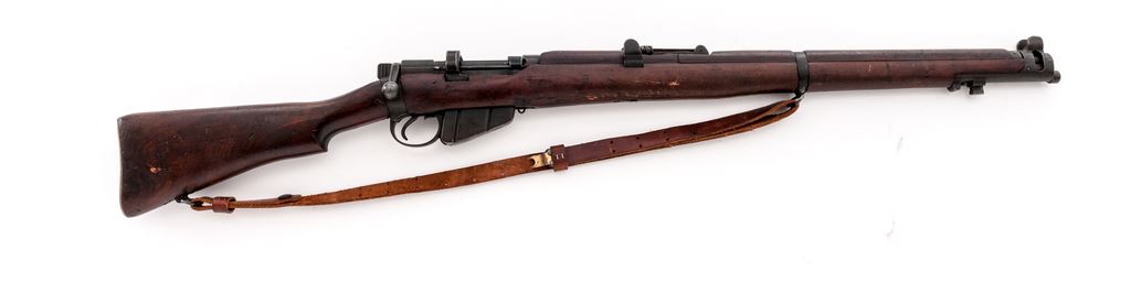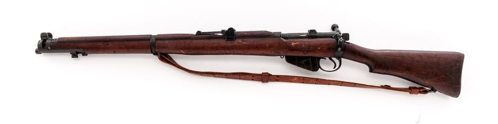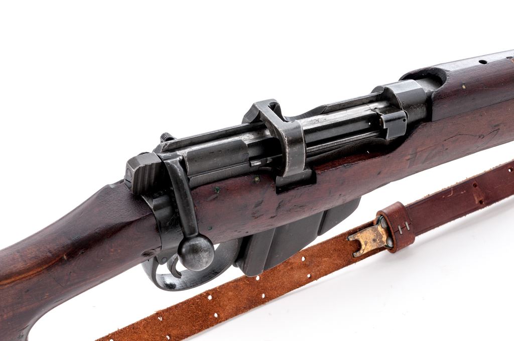 Australian No. 1 Mk III Lee-Enfield Bolt Action Rifle, #89428, .303 Brit. cal., 25.2'' barrel, blued finish, hardwood stock, blade front sight with protecting ears and adjustable tangent rear sight. Marked on right side of action body with Lithgow arsenal information over ''1944''. Right side of short buttstock stamped ''MA'' and ''1944''. Matching numbers. Condition overall is very good with over 95% finish remaining on the metal with patina on the bolt. Wood is good with scars on the underside of the forend and other handling marks. Action is smooth, bore is very good. Import stamped on right side of receiver. Includes a good condition leather sling. Est.: $300-$450. (C&R)