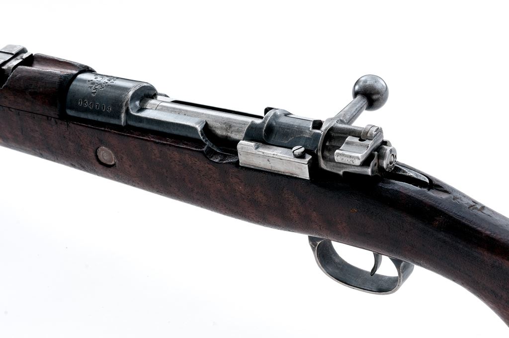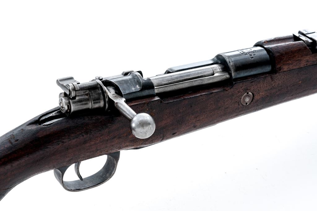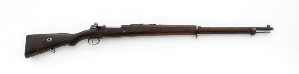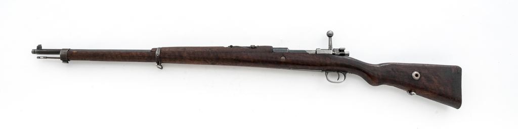 Turkish M1938 Mauser Bolt Action Rifle, #154714, 8x57mm cal., 29'' barrel, blued finish, hardwood stock, inverted ''V'' front sight and adjustable tangent rear sight. Marked on top of receiver ring ''TC/ASFA/ANKARA/K.KALE/1944'' around Turkish crest. Mismatched number on bolt, other numbers match. Includes cleaning rod. Condition overall is very good with metal surfaces retaining over 85% finish. Forend has a chip behind the front band, otherwise wood is very good with light handling marks and overall darkening. Action is smooth, bright bore is about excellent. Import stamped on right side of barrel. Est.: $200-$300. (C&R)