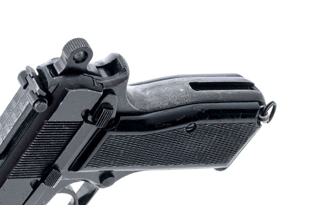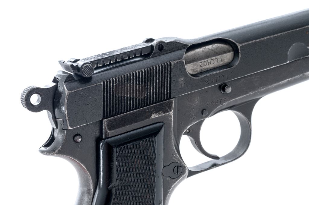 Inglis MK 1* Semi-Automatic Pistol, #2CH771, 9mm, 4.75'' barrel, phosphate finish, factory checkered black plastic grips, tangent rear and acorn front sight, slotted for combination shoulder stock/holster, with one ''JI'' marked 13-round magazine. Tangent sight calibrated 50-500, with small lanyard ring in left lower portion of frame. Matching numbered slide, frame and barrel. Condition is very good retaining approx. 80%-85% arsenal phosphate finish. Grips with moderate wear. Good action, very good bore. Est.: $500-$750. (C&R/PPT)(High-cap mags not available to Calif. residents.)