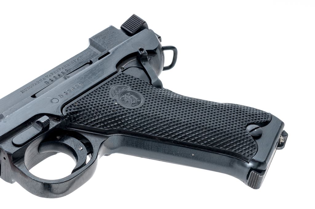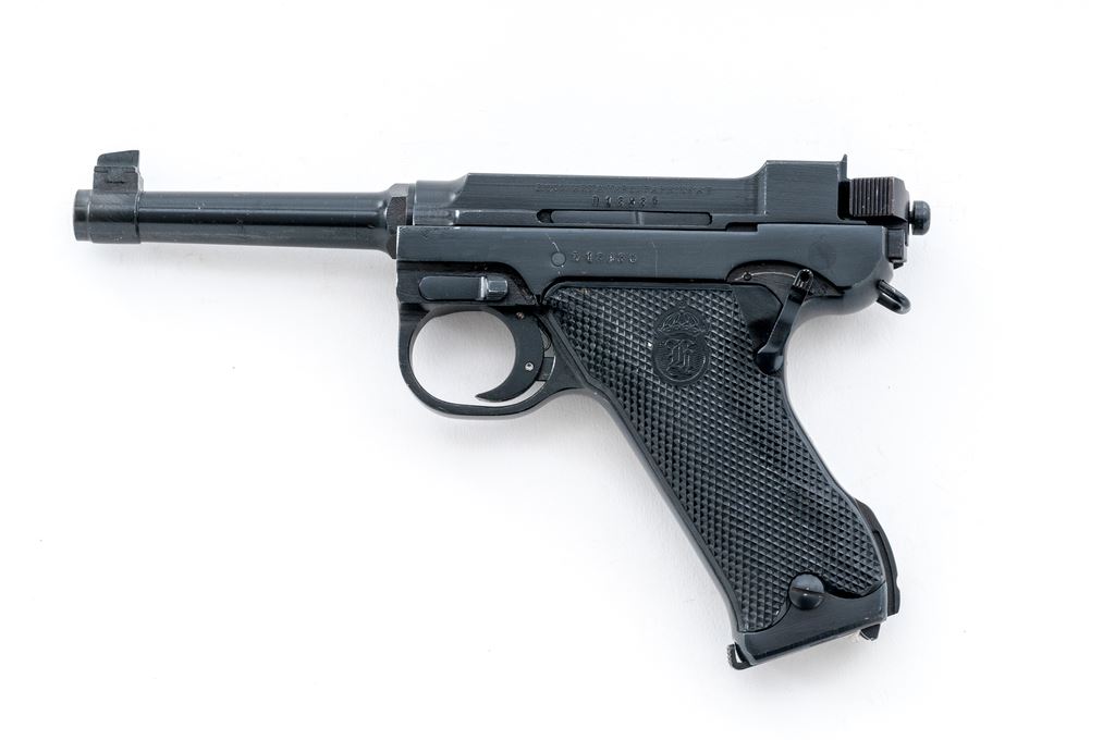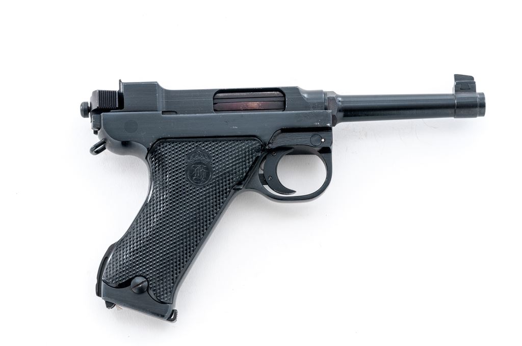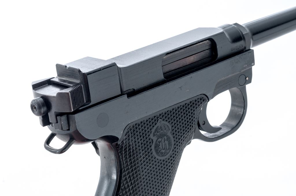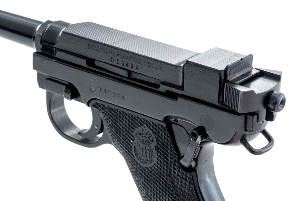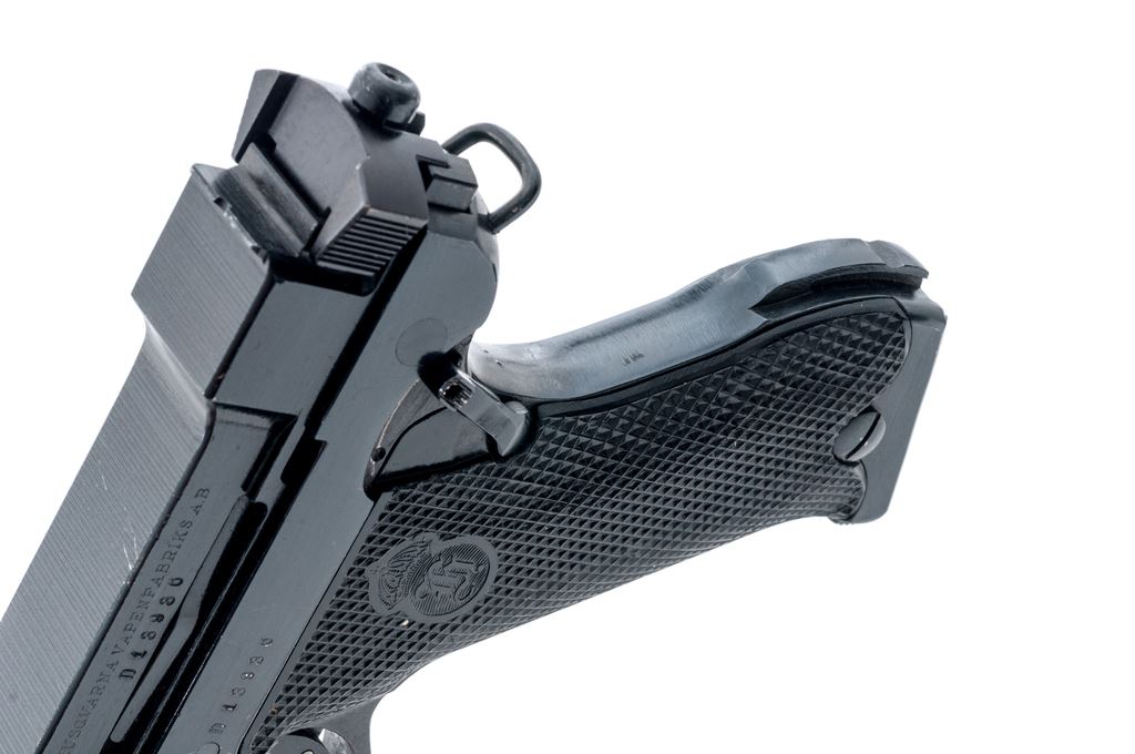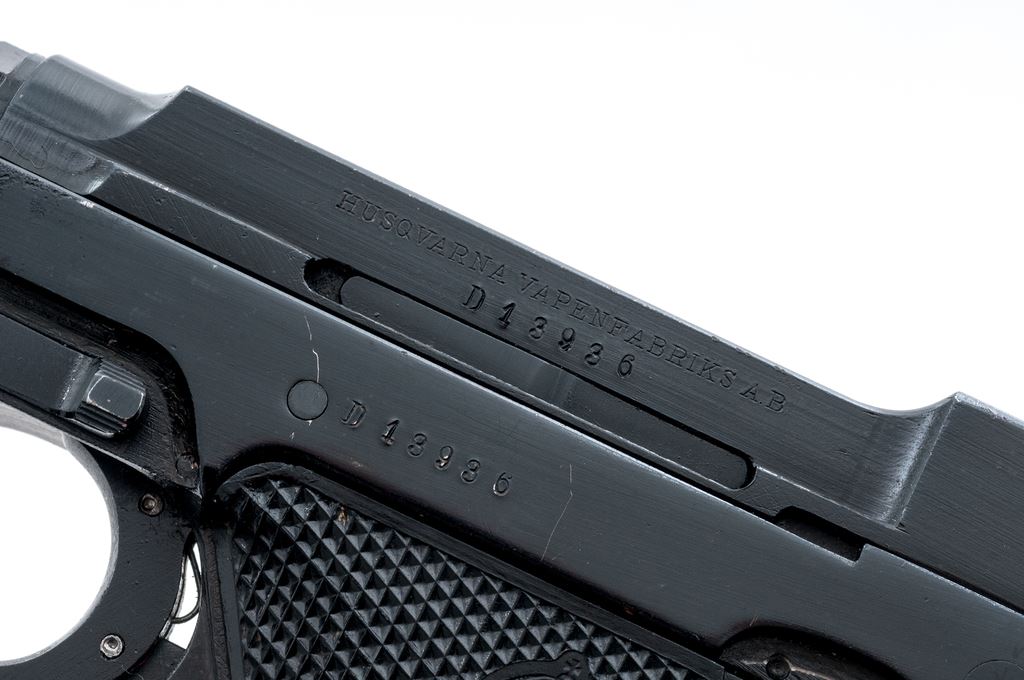 Swedish Lahti Model 40 Semi-Automatic Pistol, #D13936, 9mm, 5.5'' barrel, blue finish, black checkered plastic grips, with ''(crown)/H'' logo. Originally mfg'd by Husqvarna. Mfg'd from 1942-1946, with approx. 84,000 produced. Condition is excellent, with matching numbered frame and upper receiver, retaining approx. 96% very lightly thinning blue, and mild spray pitting to forward portions of frame and left side of barrel. Finish appears to be a high quality Swedish arsenal refinish, as at time of importation, ''Sweden'' was stamped to right side chamber area. These markings, as well as the light pitting, have been blued over. Grips and action are crisp, bore is mirror bright. Est.: $450-$650. (C&R/PPT)