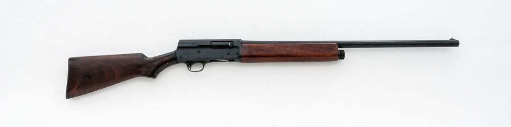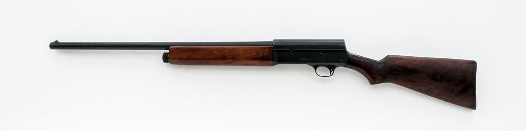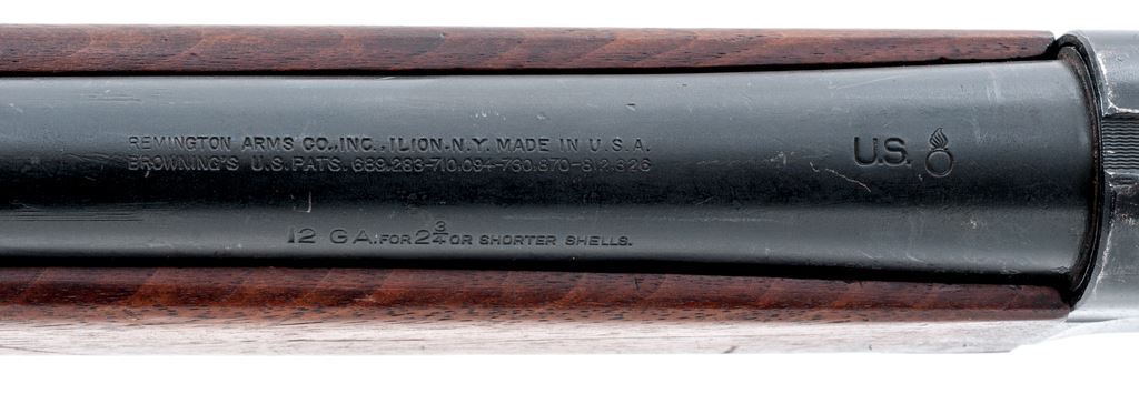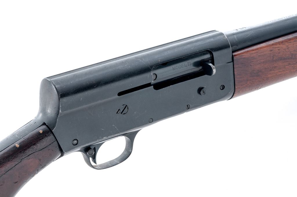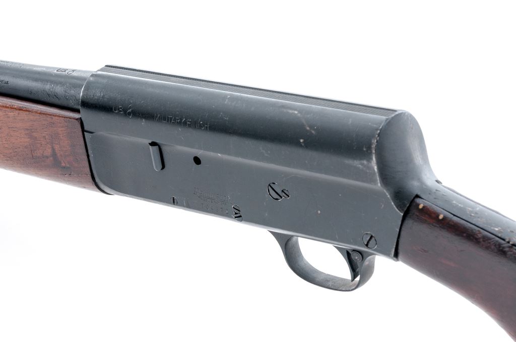 Military Finished Remington Model 11 Semi-Automatic Shotgun, with Army Ordnance markings, #704372. 12 ga. 26'' plain barrel has a 2-3/4'' chamber, IC choke, and is dated 11-43. Receiver is finished flat black, and has ''U.S./(bomb)'' and ''Military Finish'' markings. Wood is standard uncheckered walnut, with original Remington plastic buttplate. Condition appears to be as issued and heavily used, with numerous marks and gouges to wood, including one repaired and two unrepaired cracks, and numerous light marks to receiver finish. Appears to be an authentic veteran. Est.: $400-$500. (C&R)