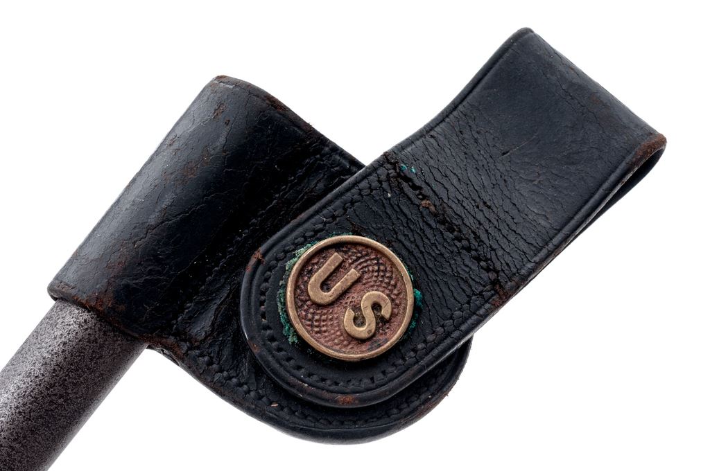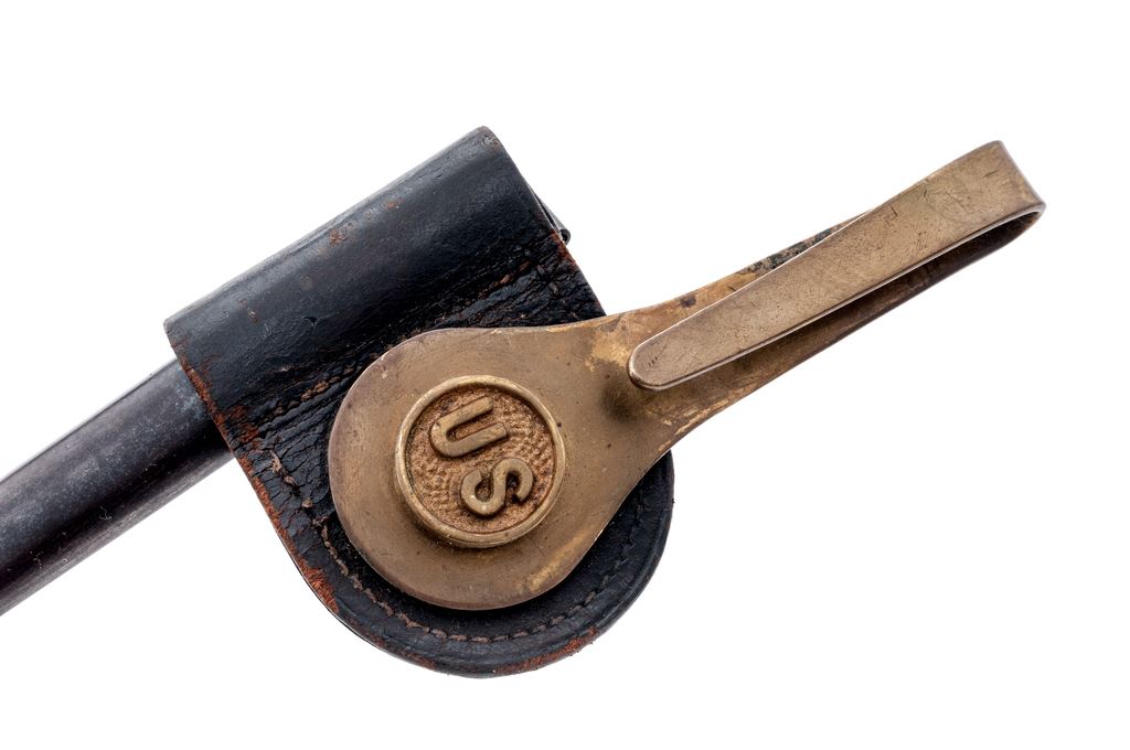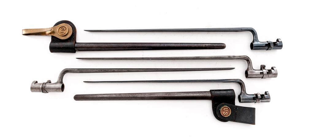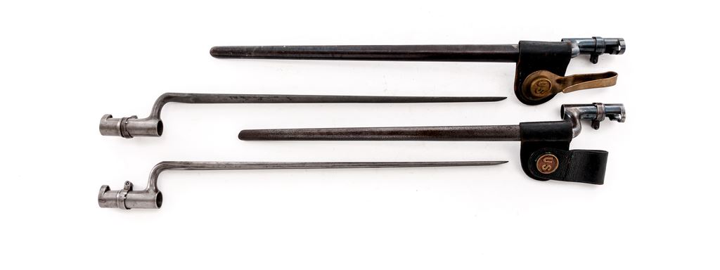 Lot of Four (4) U.S Model 1873 Socket Bayonets, all stamped ''U.S.'' on ricasso: 1.) Condition of bayonet is excellent with over 95% of the dark blue finish remaining on the metal. Locking ring turns stiffly. Scabbard is very good with light browning to the metal and no dents. Leather is very good with minor stitching separation. 2.) Condition of bayonet is good with approx. 75% finish remaining on the metal, with hammering marks to the elbow and socket and nicks to the blade. Locking ring turns smoothly. Scabbard is good with overall light pitting. Leather is cracked but still pliable. 3.) Condition of bayonet is good with cleaned metal and pitting on the blade. Locking ring is loose. No scabbard. 4.) Condition of bayonet is good with cleaned metal and light pitting to the blade. Locking ring turns smoothly. No scabbard. Est.: $250-$350/lot.