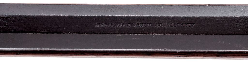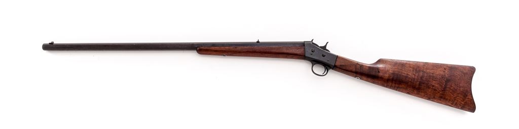 Remington No. 4 Rolling Block Single Shot Rifle, #46044, .32 Rem. RF cal., 24'' octagonal barrel, with dovetailed blade and notched rear sights, marked ''Remington Arms Co., Ilion, N.Y.'' on top flat; steel receiver with integral triggerguard, rolling breechblock, hammer and crescent buttplate; oil-stained walnut forearm, and matching buttstock with steel buttplate. Mfg'd ca. 1890-1933. Condition is very good. Metal surfaces show a smooth brown patina, with sharp edges and markings. Stocks are sound and smooth, with a professionally done wood repair at wrist (including a 2''x1'' wood replacement at left-side juncture with frame and a filled hole at bottom). Action is crisp; bore is eroded but with visible rifling. Est.: $150-$250. (C&R)