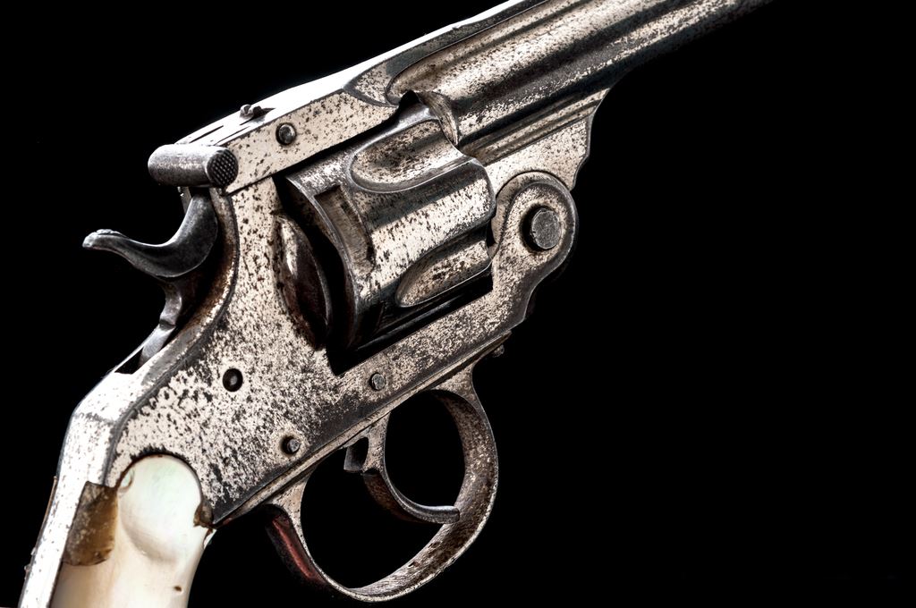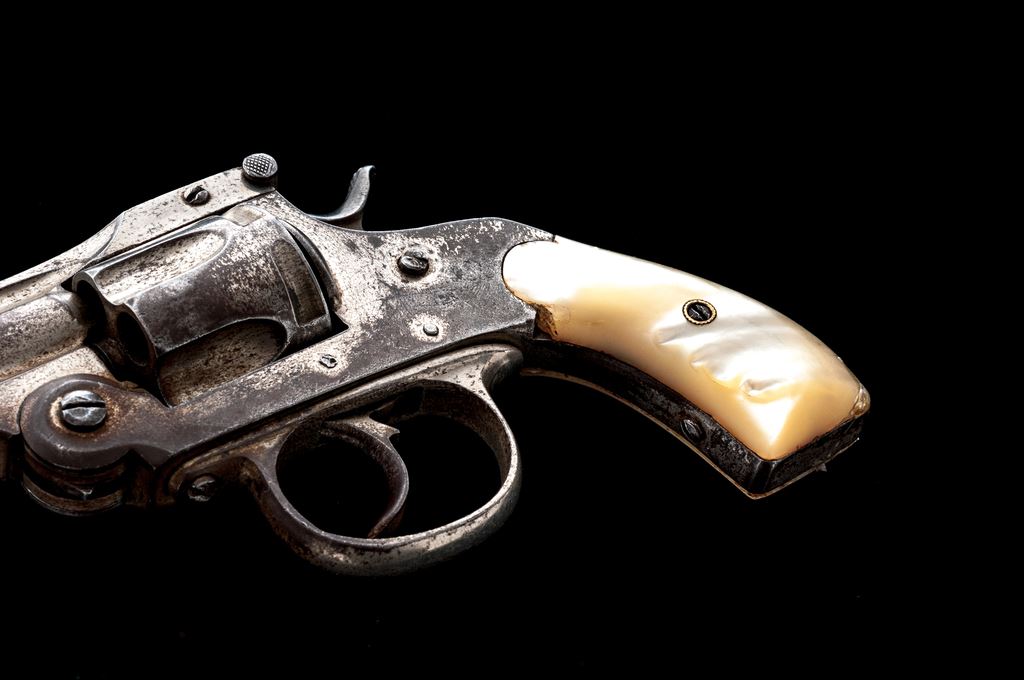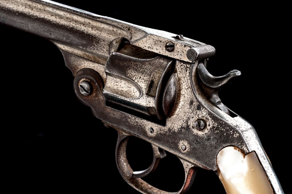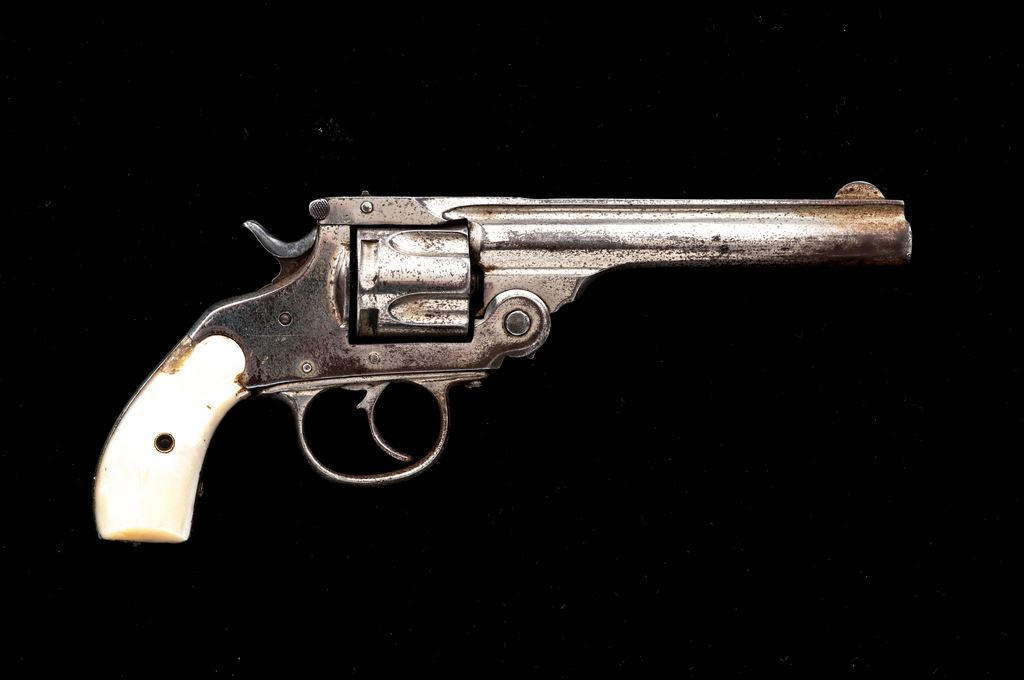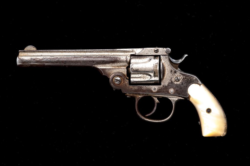 Antique Copy of a Smith & Wesson Top-Break Double Action Revolver, probably Spanish, by ''Smill & Welson, Sprangfeld, Mus. E.U.A.'', #402466, .38 CF cal., 5'' barrel marked with the ''Smill & Welson'' name, address and various patent dates in two lines on top rib, fluted 5-shot round cylinder; S&W style large front barrel hinge, frame with integral gripstraps; two-piece plain mother-of-pearl grips. Mfg'd ca. 1880s-90s, originally with full nickel-plate finish. Condition is very good, retaining approx. 40% nickel overall (where missing, a gunmetal gray color) mixed with scattered discoloration; MOP grips have a few edge chips, no cracks and brilliant iridescence. Barrel hinge is sound; action functions but cylinder does not lock up; bore is dirty with shallow rifling. Est.: $200-$400. (Antique)