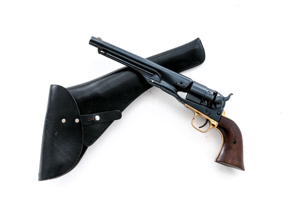 Composite Colt Model 1860 Army Percussion Revolver, perhaps partly a 2nd Generation Colt, #85154, with reproduction black leather holster, .44 cal., 8'' ''streamlined'' barrel with a small German-silver blade front sight marked with the one-line Colt address; patent ''creeping'' loading lever; rebated round 6-shot cylinder with the rolled naval battle scene; frame marked ''Colts/Patent'' on left side; Navy-size brass gripstraps; oil-finished two-piece hardwood grips. Condition is good as completely refinished in a heavy blue-black, cylinder scene and other markings are weak or obliterated, brass with a light patina. Gripstraps and grips are incorrect replacements, visible serial numbers match (but for cylinder and wedge) including cylinder arbor. Action functions but does not hold full-cock; bore is dirty but shows good rifling. Holster is very good showing virtually no use. Est.: $200-$400. (No FFL Required)