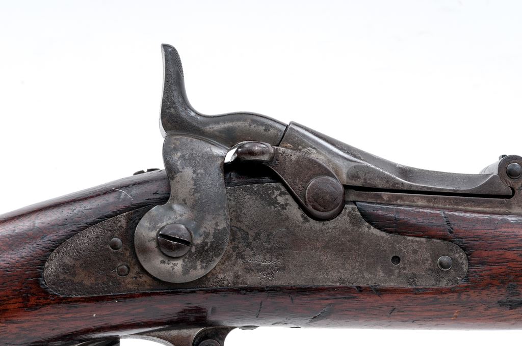 U.S. Springfield Model 1888 ''Ramrod Bayonet'' Trapdoor Infantry Rifle, #558943, .45-70 Gov't. cal., 32-5/8'' barrel with block-blade front sight and Buffington rear sight (correctly marked ''R'' for Rifle) marked ''V/P/(eaglehead)/P'' and ''A'' at breech; trapdoor breechblock is marked ''US/Model/1884'' in three lines at hinge; flush-mounted lockplate has a spread-wing eagle clutching olive branches ahead of hammer (other markings obscured); correct one-piece triggerguard with sling swivel at front; steel furniture including two spring-retained barrel bands (top band with stacking swivel), buttplate with sliding door opening to trap for cleaning rod (not present) is marked ''US'' behind tang screw; one-piece ramrod bayonet. Oil-stained walnut fullstock with ''SWP/1892'' (Samuel W. Porter) inspector's cartouche on left side. Mfg'd ca. 1889-93. Condition is all original and very good, the steel parts generally a smooth gunmetal gray-brown, the lockplate with pitting at rear and partially obscured markings. Stock shows the expected marks of military use and age and losses at top band on right side and along the ramrod channel, otherwise solid. Action is strong and smooth; bore is shiny with distinct rifling. Est.: $750-$1,250. (Antique)
