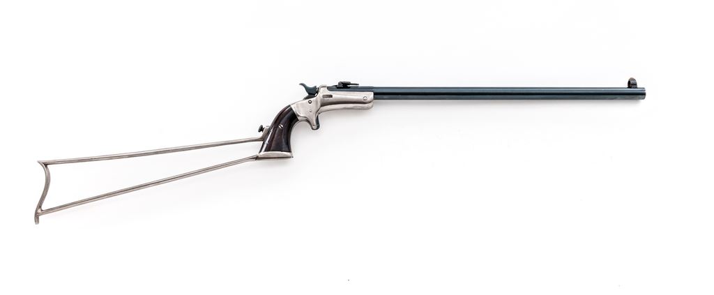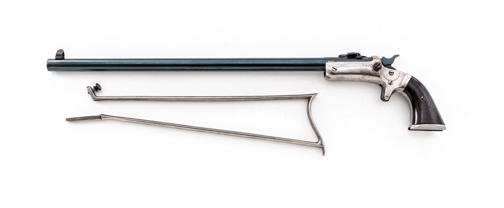Antique Stevens New Model Tip-Up Pocket Rifle, 2nd Issue, with detachable shoulder stock, #9586, .22 RF cal., blued 14-7/8'' part-round part-octagonal barrel, with hooded Globe type front and adjustable leaf rear sights marked with the maker's name, address and 1864 patent date on left side at breech; nickel-plated frame with barrel hinge at front and knurled release button on left side, has integral spurtrigger sheath, straight gripstraps and firing pin in a bushing; skeleton stock attached by a bottom dovetail and knurled top screw; varnished rosewood grips. Mfg'd 1875-96. Condition is good to very good. Barrel, hammer and trigger retain all of what is likely an expert old reblue; frame and shoulder stock retain virtually all of their original nickel plating. Grips with most original varnish and scattered handling marks. Barrel hinge is strong; action is crisp; bore is etched but with defined rifling. Est.: $450-$650. (Antique)