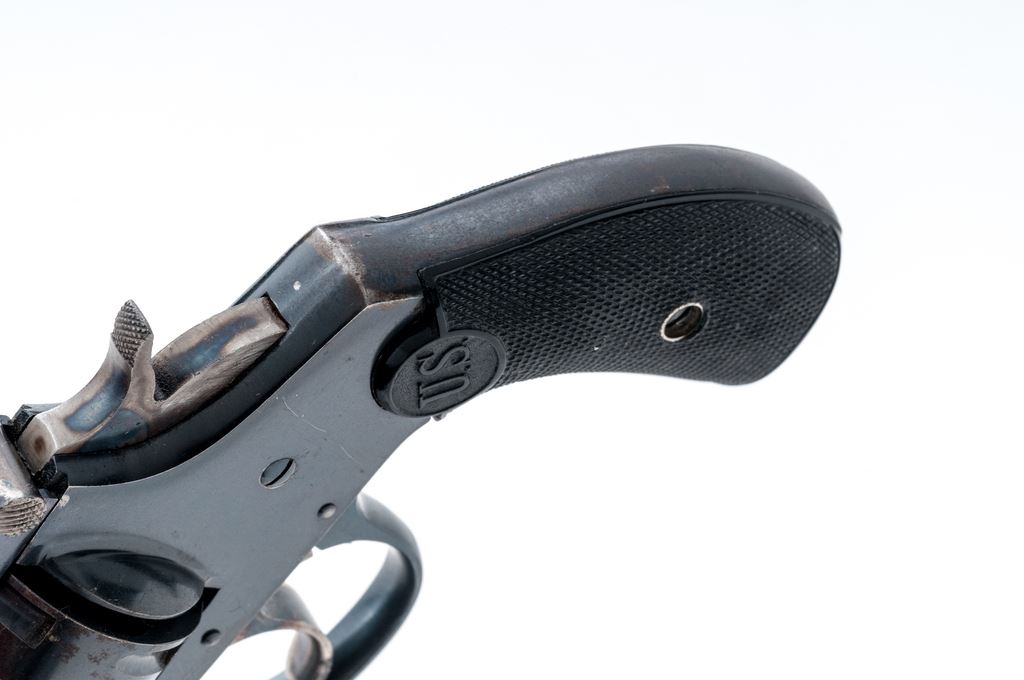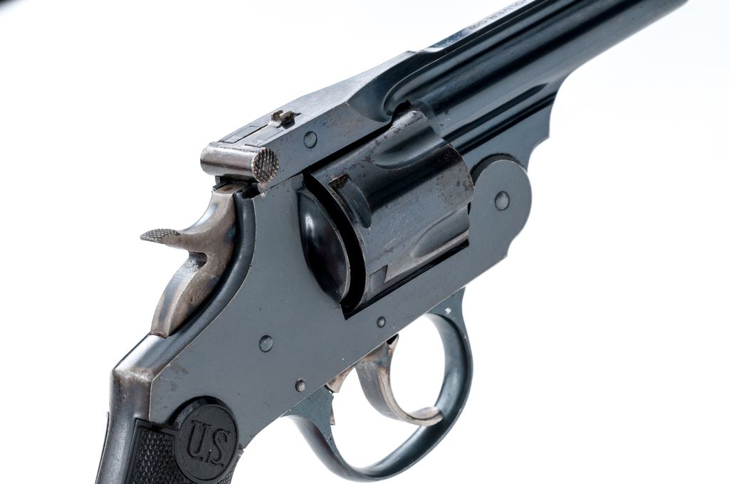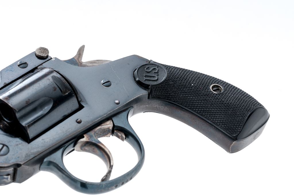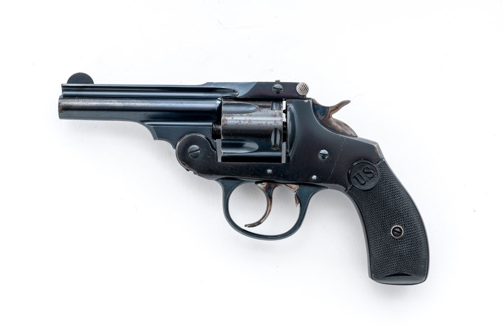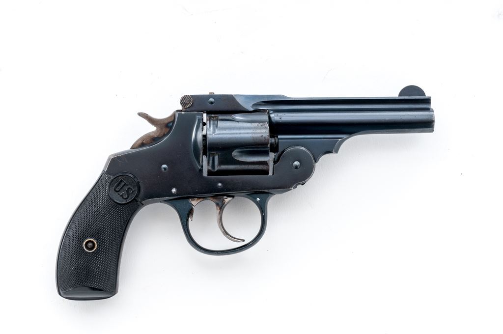 Top-Break Double Action Automatic Ejector Revolver, by U.S. Revolver Co., #7365, .38 CF cal., 3.5'' barrel marked ''U.S. Revolver Co.'' on top rib, fluted 5-shot round cylinder; frame with S&W style large front hinge and integral gripstraps; finely checkered two-piece black hard rubber grips have relief ''U.S.'' circular logo at top. Patterned after S&W's contemporary array of .38 Double Action revolvers. Originally mfg'd with full blued finish. Condition is excellent, retaining approx. 90% glossy deep blue to barrel, cylinder (with occasional light roughness between flutes), frame (darkening to gripstraps) and triggerguard; bright case hardening colors to hammer and trigger, and perfect unmarked grips having sharp checkering and detail. Barrel hinge and latch are strong; action is crisp in both single- and double-actions; bore is shiny with deep rifling. Est.: $150-$350. (C&R)