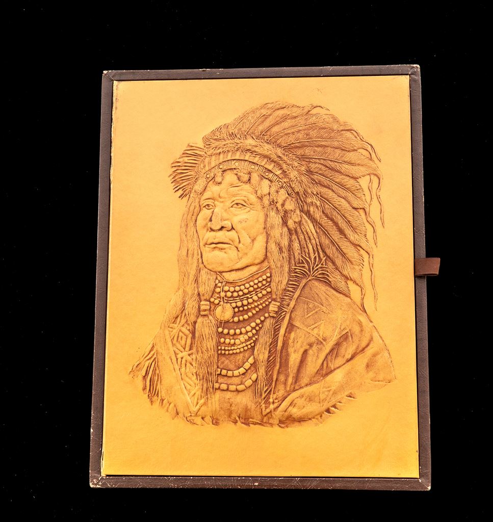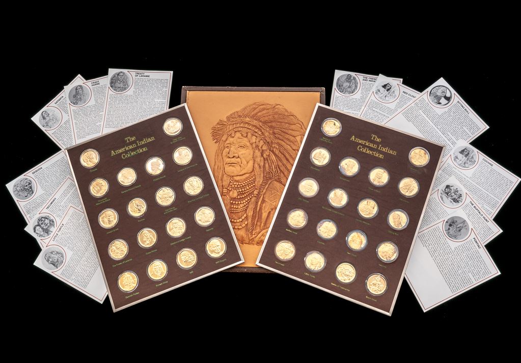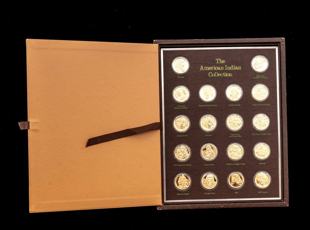 Museum of Indian Heritage American Indian Medals Collection, issued by the Hamilton Mint (1976). Complete set of 36 gold-plated sterling medals, in book casing with beautiful embossed leather cover of Indian warrior. Condition is near excellent with only minor edgewear and slight split at cover. Includes documentation on each medal. Est.: $400-$500/set.