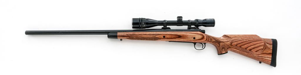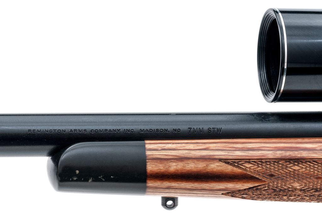 Remington Model 700 Bolt Action Rifle, #E6377042, 7mm STW cal., 26'' heavy barrel, blue finish; one-piece brown Monte Carlo laminate wood stock is point checkered at the wrist and forend, with cheekpiece, black rubber Remington recoil pad, ebony forend and grip cap, sling swivel studs. Mfg'd without sights, this rifle is topped with a Tasco 6-24x40mm scope; scope with an old style range finding reticle, gloss black finish, and lens covers. Condition overall is very good showing signs of poor storage and handling. Metal surfaces retain approx. 97% original blue finish, barrel with scattered scratches and a few small spots of surface rust; factory lettering is clear and defined. Stock with scratches and impressions, which includes a few spots of concentrated wear on the right side of the buttstock; checkering is mostly clean and sharp, right side forend checks with a few flat spots. Smooth action; bright bore with excellent rifling; internally a clean rifle that appears to have been fired very little. Est.: $300-$500. (Modern)
