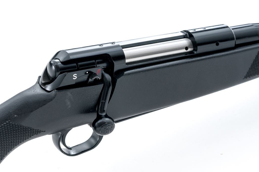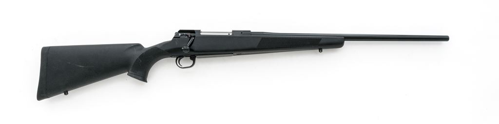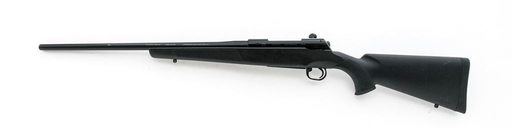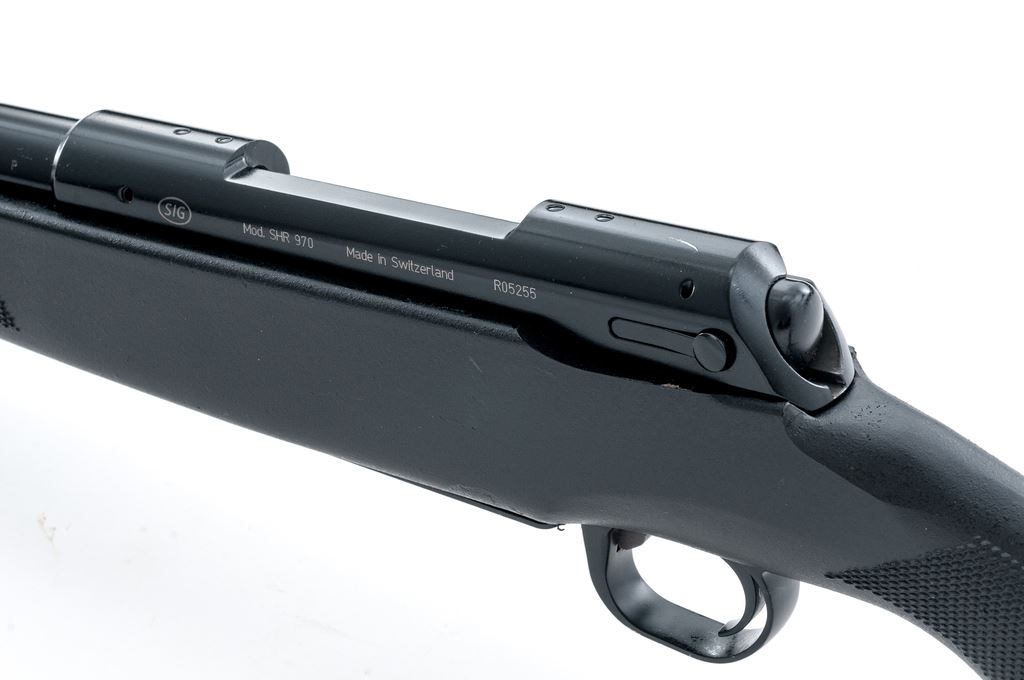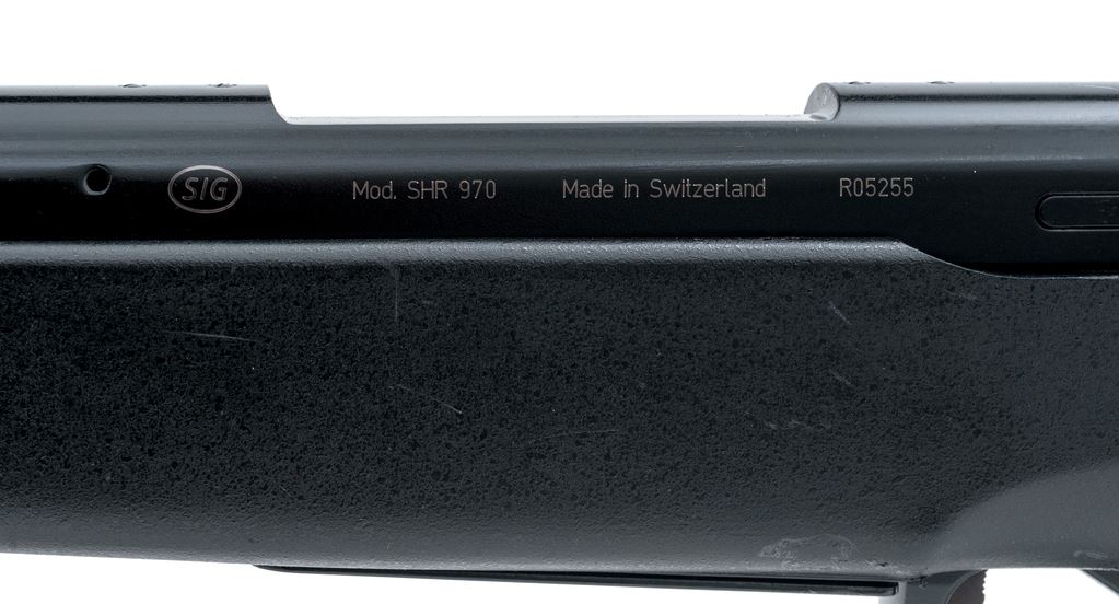 Sig Arms SHR 970 Synthetic Bolt Action Rifle, #R05255, .270 cal., 22'' barrel, dark blue/black finish; one-piece black synthetic stock is checkered at the pistol-grip and forend, with black rubber Sig Arms recoil pad and sling swivel studs. From the factory without sights, top of receiver is factory drilled and tapped for a scope base, with cocking indicator, 3-position safety, detachable magazine. Triggerguard with the original hang tag still attached. Made in Switzerland. Metal surfaces are in fine overall condition with approx. 97% remaining original finish; barrel and receiver with scattered moderate scratches and handling marks. Stock is very good with light scuffs and scratches; checkering is mostly sharp, right side grip with a scratch that extends halfway across the checks. Really nice smooth action, mirror bright bore with excellent rifling; internally very clean, appearing to have been fired very little; external wear is from handling and storage. Est.: $300-$400. (Modern)