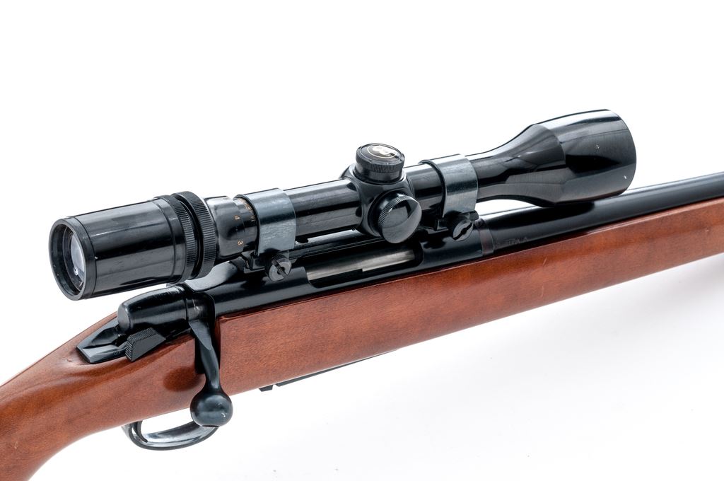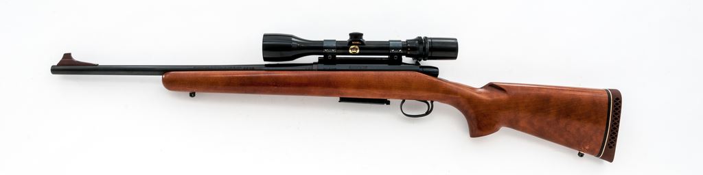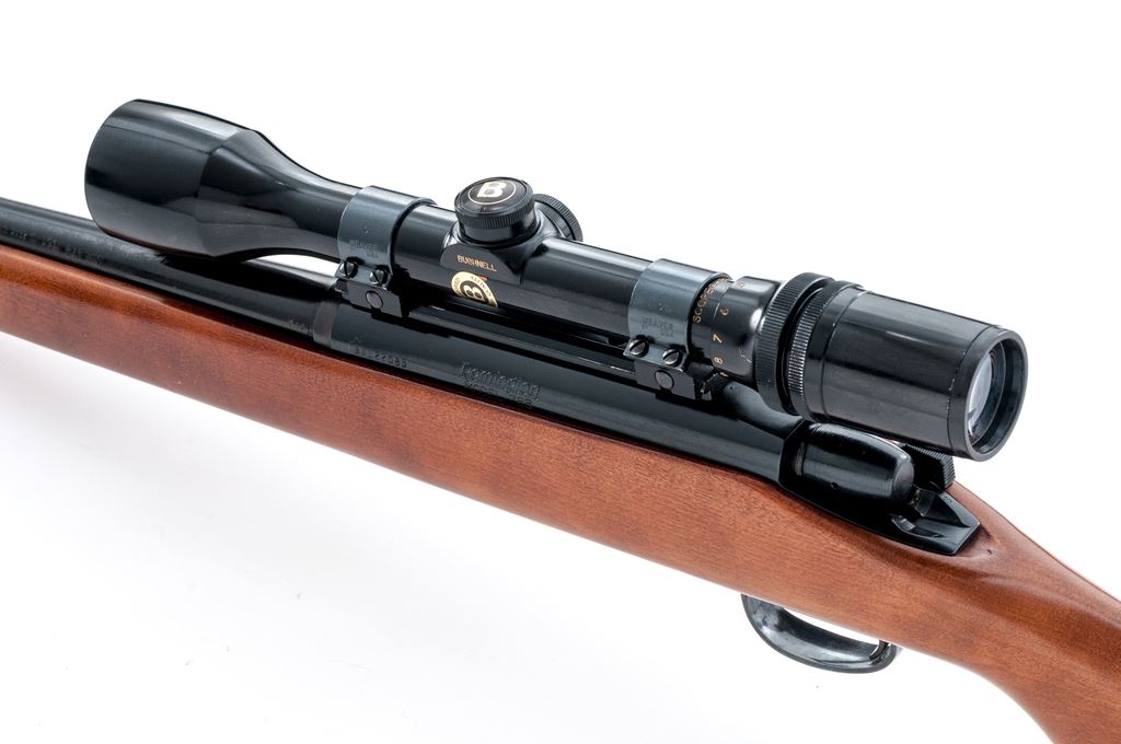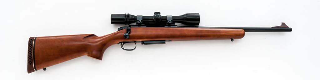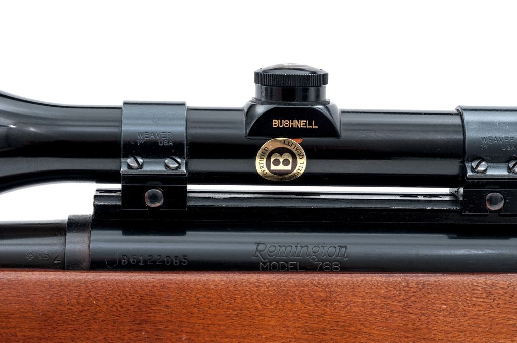 Remington Model 788 Bolt Action Carbine, #B6122085, .243 cal., 18.5'' barrel, blue finish; one-piece pistol-grip birch stock with a vented brown rubber Pachmayr recoil pad, sling swivel studs; LOP over rubber pad is 12-3/8'', end of wood 11-1/2''. Blade front sight, no rear sight or plug screws, with one correct magazine. Topped with a Bushnell Scope Chief VI 3-9x scope on Weaver mount; scope with a duplex reticle and gloss black finish. Metal is excellent retaining approx. 99% original blue finish. Factory lettering is clear, barrel address with nice raised edges. Wood is fine retaining nearly all of the original varnish with scattered small marks from handling and field use, right side of the forend with a small but slightly deeper impression. Smooth action, mirror bright bore with strong rifling. Scope exterior with a few small nicks and scratches; optics are clear. Est.: $300-$500. (Modern)