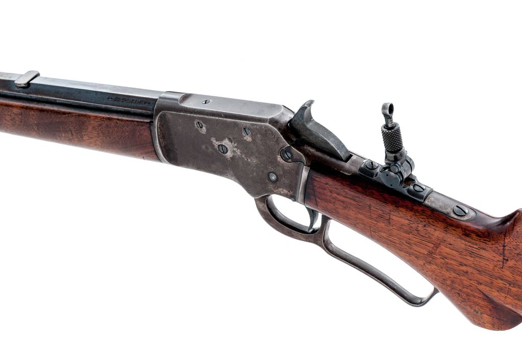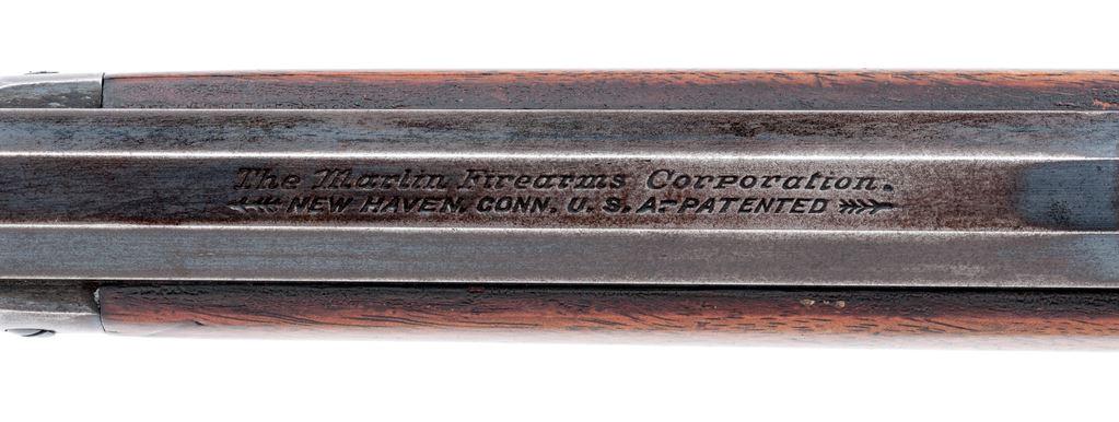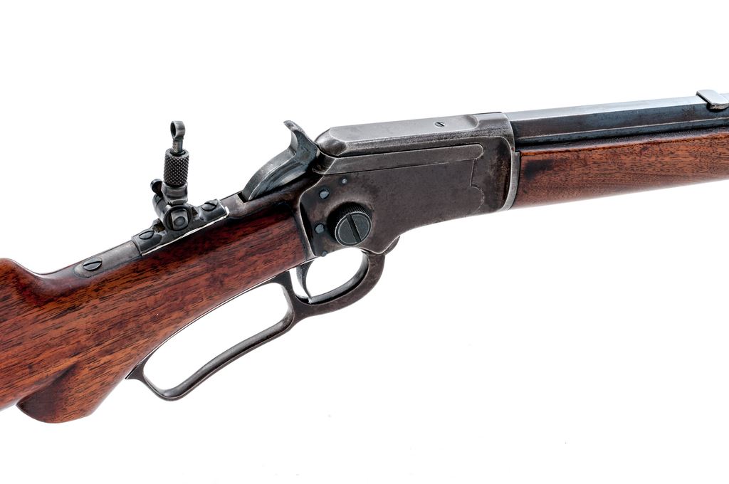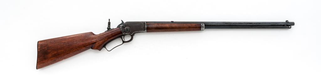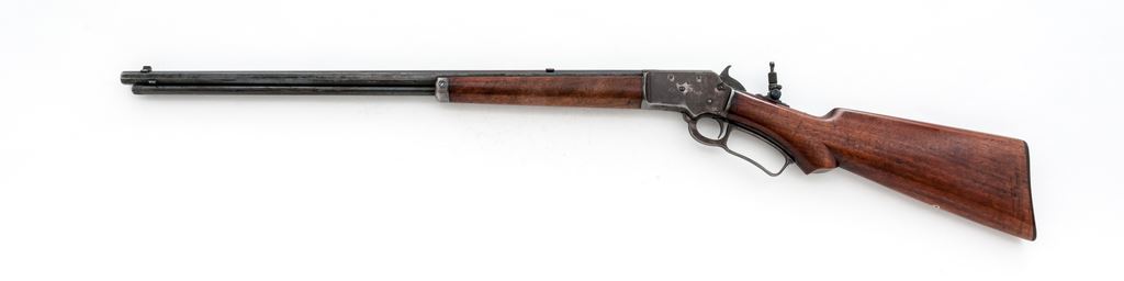 Marlin Model 39 Lever Action Rifle, #6490, .22 RF cal., blued 24'' octagonal barrel, with dovetailed bead-blade front sight (rear sight dovetail is plugged), marked with maker's name, address and ''Patented'' in two lines on top flat, and ''22 S-L & L-R'' at breech; tubular cartridge magazine; case hardened receiver with side ejection and large knurled right-side takedown knob, is mounted with a folding screw-adjustable Lyman peep tang sight, is marked ''Marlin/Mod. 39'' on top tang, and the ser. no. at lower tang; loop operating lever; varnished walnut forearm with steel nose cap, matching pistol-grip buttstock with checkered hard rubber buttplate having ''Marlin'' within a relief panel. Mfg'd ca. 1922. Condition is very good. Barrel retains approx. 65% smooth original blue (with possibly some added coloration), mag tube 50%, nose cap a smooth brown patina; edges and markings are sharp; receiver, hammer and lever show faintly mottled colors but have mostly darkened and silvered out. Stocks are sound and smooth with only light marks, nice grain and color, and most varnish finish. Action is smooth; bore shines with deep rifling. Est.: $300-$450. (C&R)