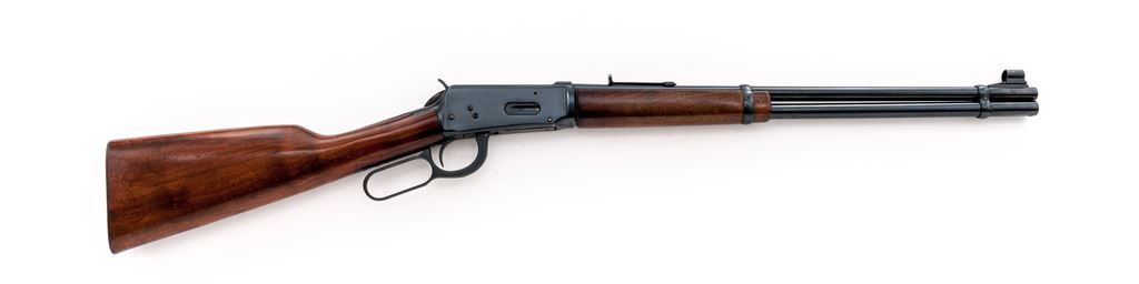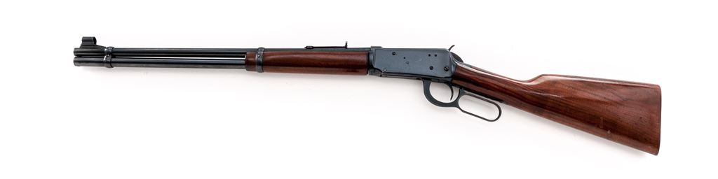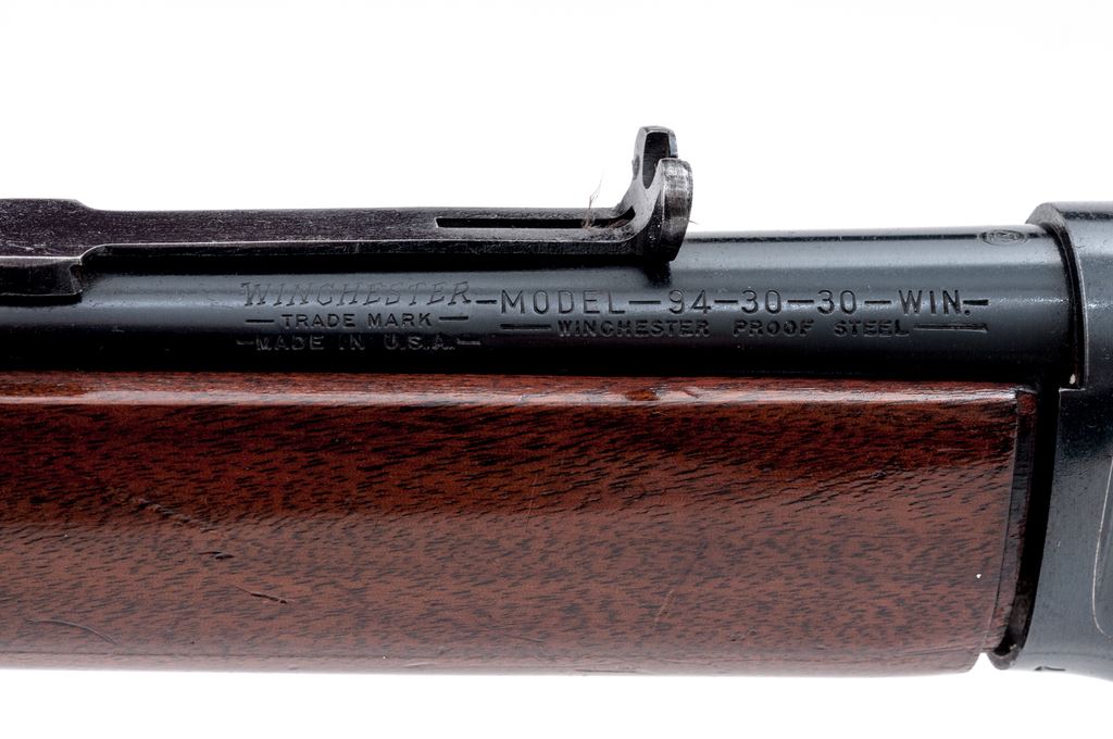 Winchester Model 94 Lever Action Carbine, #2411577, .30-30 Win. CF cal., blued 20'' round barrel, with hooded-ramp bead front and dovetailed buckhorn rear sights, marked ''Winchester/Trade Mark/Made in U.S.A.'', and ''Model 94 - 30-30 Win./Winchester Proof Steel'' at left breech; blued tubular magazine and retaining band; blued receiver is marked with serial number at lower front; blued loop operating lever; varnished walnut forearm with blued barrel band, matching buttstock with checkered steel buttplate. Mfg'd 1960. Condition is very fine to excellent. Blued surfaces retain approx. 95% original finish with occasional light scratching. Stocks are sound and smooth with use/handling marks (forend needs re-fitting to receiver); buttplate checkering is sharp. All edges and markings are crisp; action is strong and smooth; bore is brilliant with sharp rifling. Est.: $500-$700. (C&R)