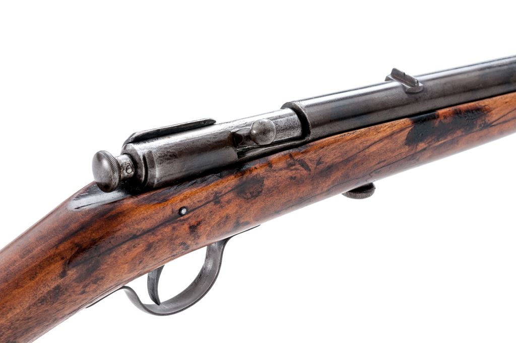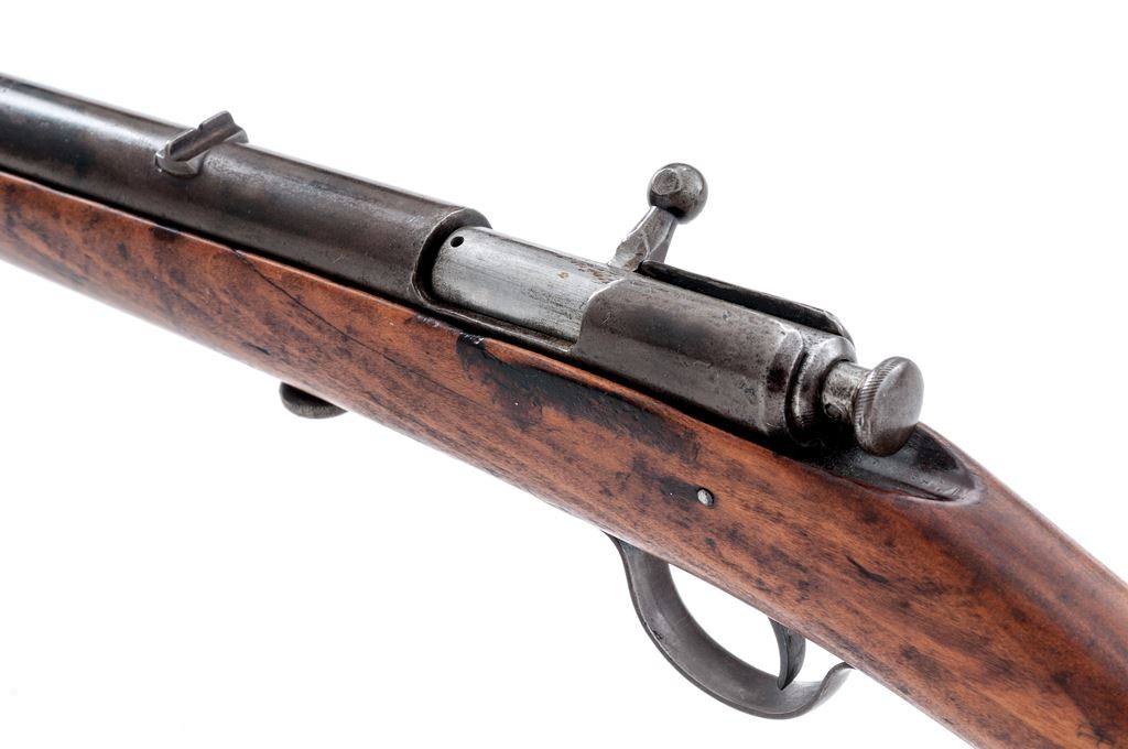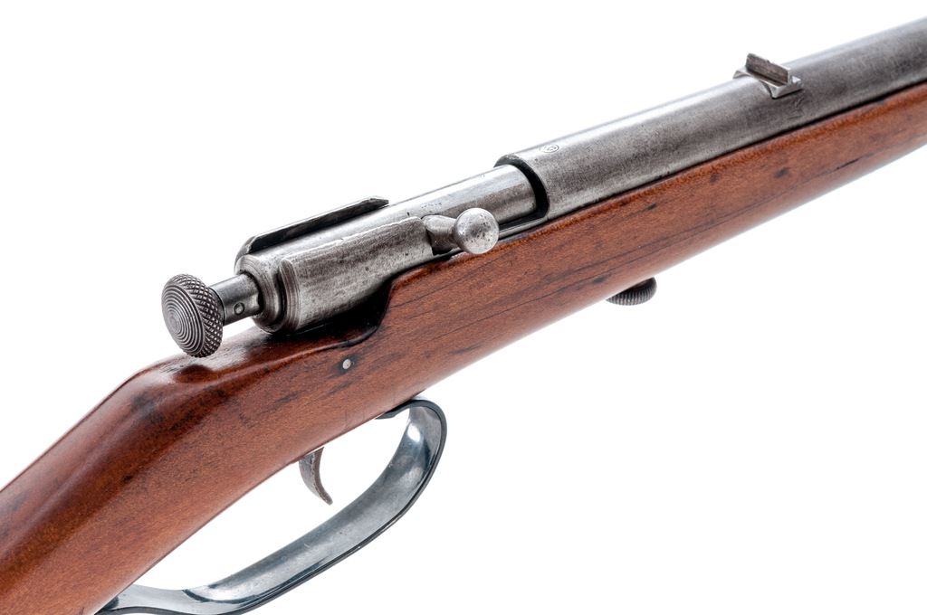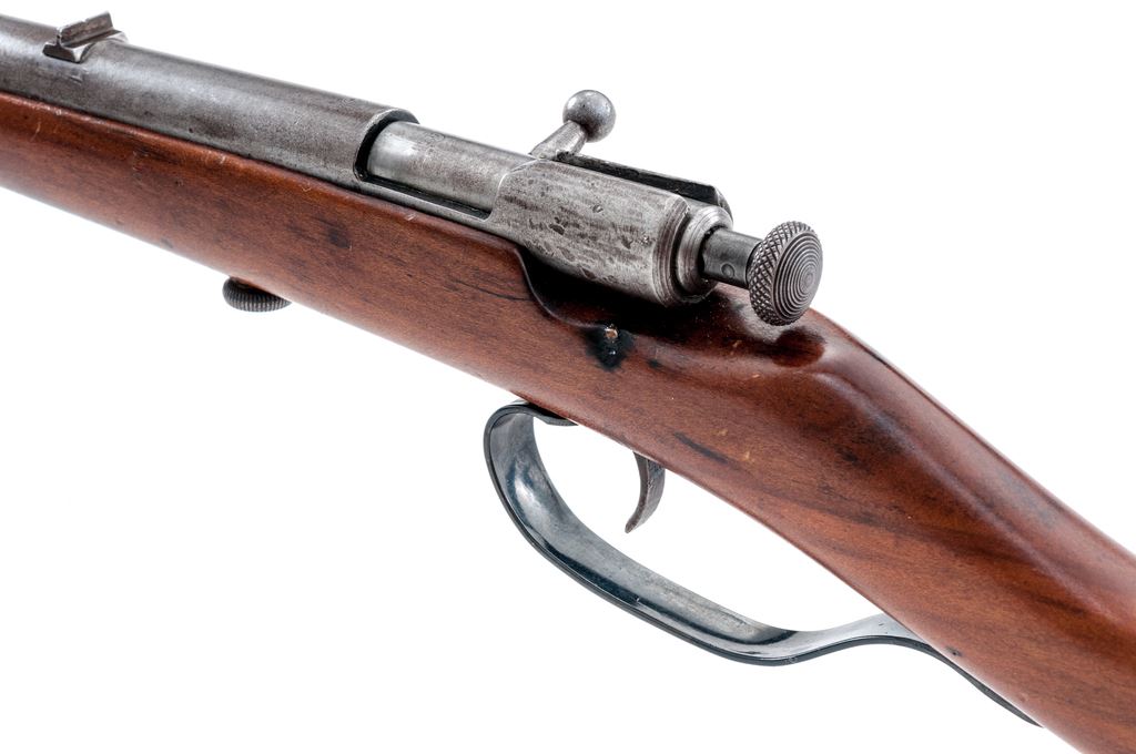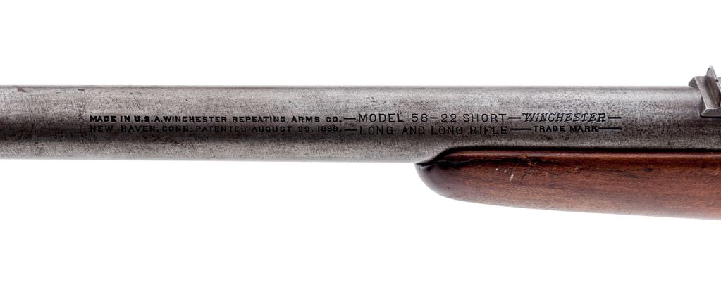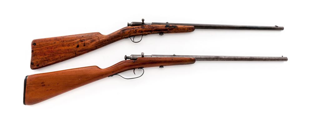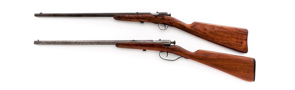 Lot of Two (2) Winchester Single-Shot Boy's or Varmint Rifles: (1) Model 1900, NVSN, .22 RF cal., 18'' tapered round barrel, with dovetailed post front and notched rear sights, marked with maker's name, address and 1899 patent date, and ''Model 1900 /22 Short & Long'' on top; action has auto extraction and a knurled bolt knob; oil-stained gumwood ''fish-belly'' halfstock has a large knurled screw retaining action in the stock, and no buttplate. Condition is good. Metal is overall gunmetal gray (the barrel with a likely later bluish tone), and good markings. Stock is sound with general use marks, repaired cracks at front, and an added oil finish. Action functions; bore is etched overall but fairly clean with good rifling. (2) Model 58, NVSN, .22 RF cal., 18'' heavy round barrel with post front and notched rear sights, is marked with the maker's name, address and 1898 patent date, ''Model 58 - 22 Short/Long and Long Rifle,'' and ''Winchester/Trade Mark'' on left side; action has auto extraction and a knurled bolt knob; oil-stained gumwood halfstock has a loop triggerguard, a large knurled screw retaining action in the stock, and a checkered hard rubber buttplate with ''Winchester/Trade Mark'' in a circular sunburst-like cartouche. Condition is good. Metal is overall gunmetal gray with scattered discoloration, dings at left side of receiver, and clear markings. Stock is sound with light use marks, a small chip and repaired cracks at front sides; buttplate checkering and logo are quite worn. Action functions; bore is bright with distinct rifling. Est.: $200-$300/Lot. (C&R)