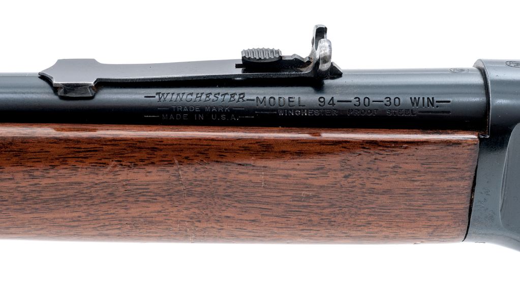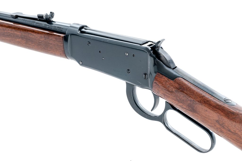 Pre-64 Winchester Model 94 Lever Action Carbine, #2520866, .30-30 cal., 20'' round ''Proof Steel'' barrel, blue finish,straight grip walnut stock and forend, checkered steel shotgun butt. Sights include a hooded red beaded blade front sight and sporting rear sight with elevator. Top of barrel and receiver are both Winchester proofed. Mfg'd 1962. Condition overall is very good with approx. 95% original blue finish remaining; right side of magazine tube with a small spot of very fine pitting that has resulted in finish loss. Receiver with some light scratching and small handling marks; barrel address, etc. is clear and defined. Wood is solid, no chips or cracks, with general shallow dents and scratches; more pronounced on the right rear portion of the buttstock. Smooth crisp action; bore is bright with excellent rifling. Est.: $400-$600. (C&R)