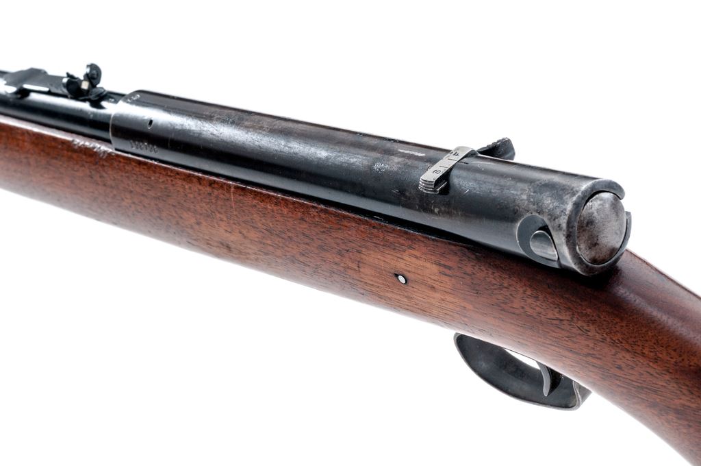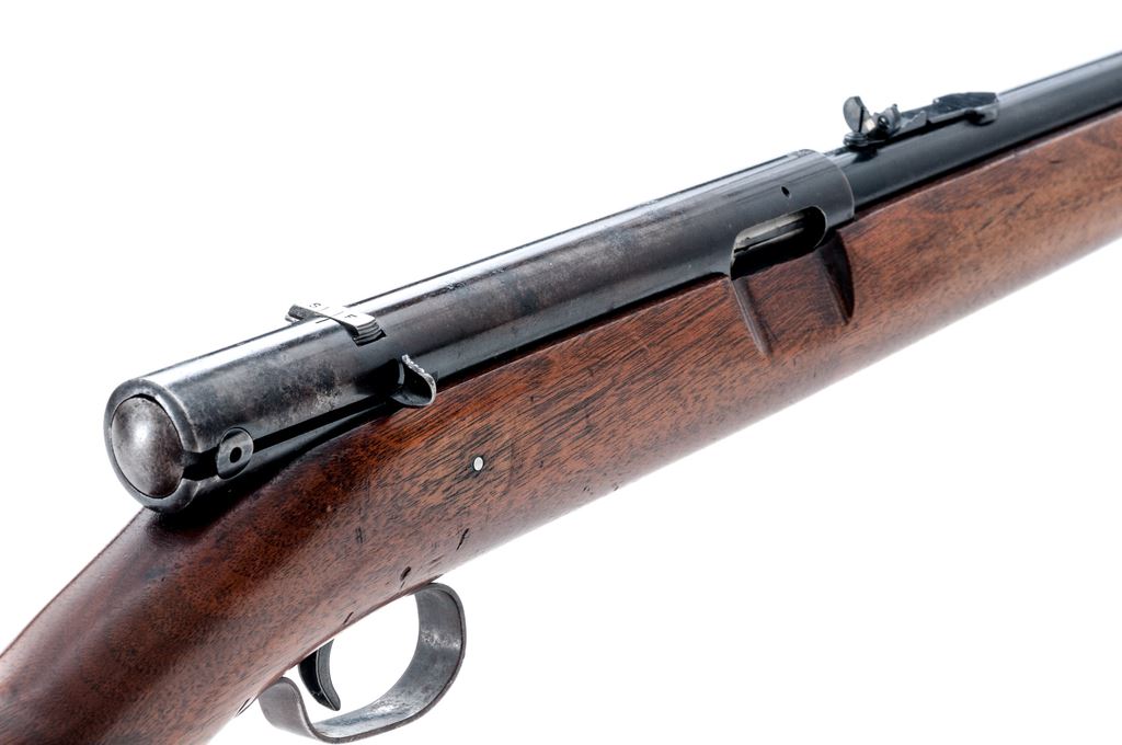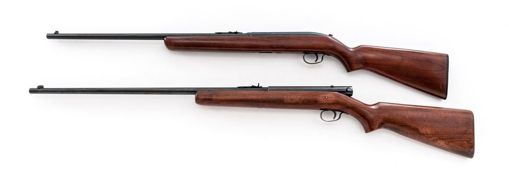 Lot of Two (2) .22 Caliber Winchester Rifles: 1.) Model 55 Single Shot Rifle, NVSN, .22 S-L-LR cal., 22'' barrel, blue finish, one-piece pistol-grip walnut stock, checkered black composition Winchester buttplate, dovetailed silver beaded front sight, notched elevator rear sight. With standard markings including Winchester proof on the top of the barrel and receiver. Metal condition is very good retaining approx. 97% original finish; receiver with specks of very fine oxidation; factory lettering is clear. Wood is good with general shallow scratches and small handling marks; left side below the chamber with an approx. 3'' hairline crack but remains solid. Smooth action, bright bore with excellent rifling. 2.) Model 74 Semi-Auto Rifle, #126736, .22 Short cal., 24'' barrel, blue finish, one-piece pistol-grip walnut stock, checkered steel buttplate, dovetailed brass beaded front sight and replacement sporting rear sight, standard markings including Winchester proof on top of barrel and receiver. Condition is good. Barrel retains approx. 95% original finish, receiver approx. 50%, both with specks of pinprick oxidation and the receiver with intermittent spots of fine pitting. Barrel address and other factory lettering is clear. Wood with general shallow scratches and dings, approx. 70% finish remains. Smooth action, excellent bore. Est.: $200-$300/lot. (Both/C&R)