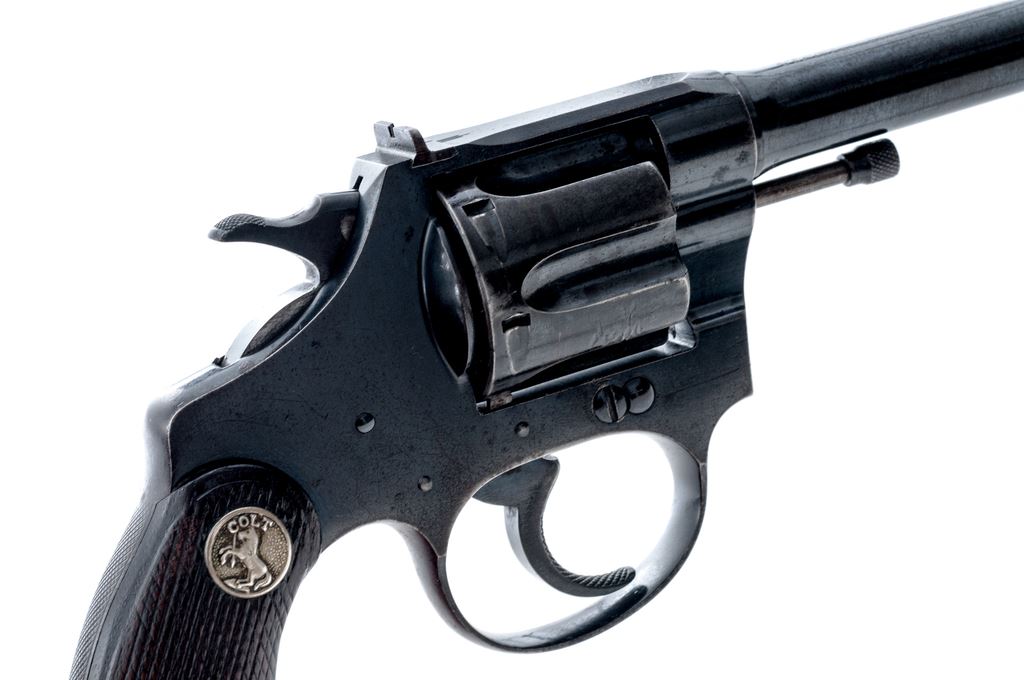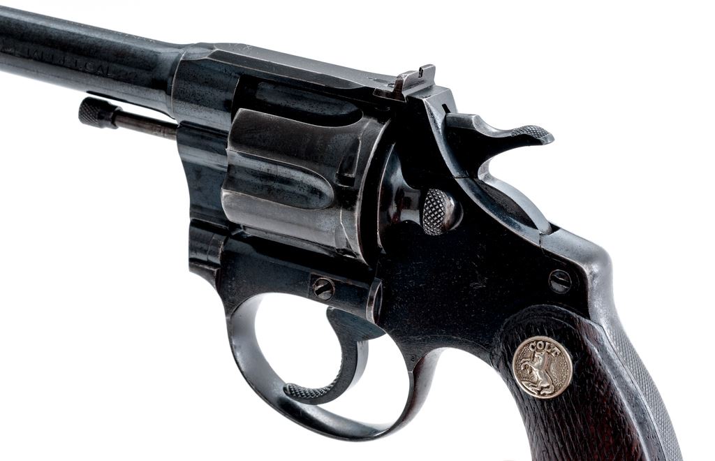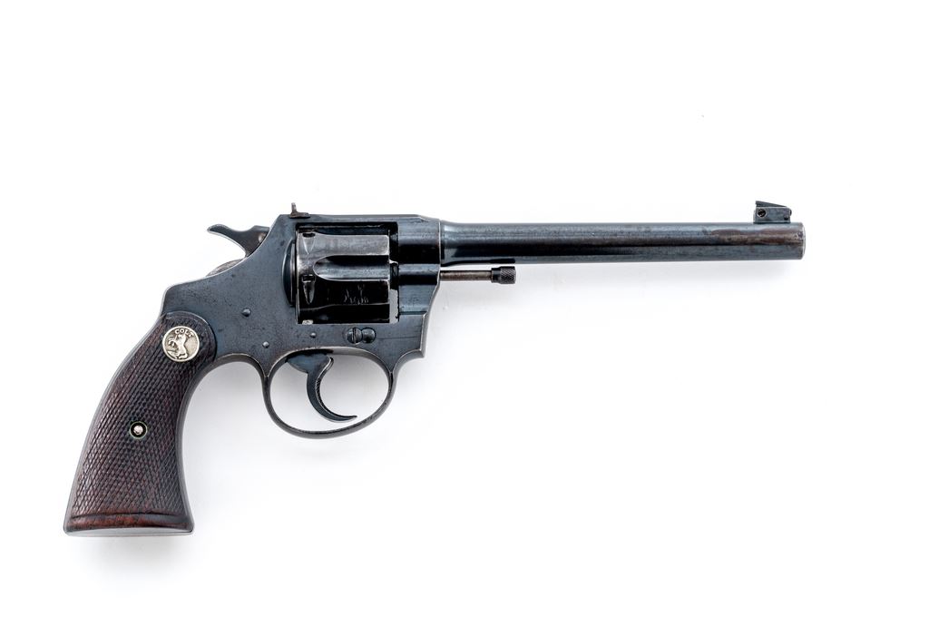 Colt Target Police Positive Double Action Revolver, #39452, .22 S-L-LR cal., 6'' barrel, blue finish, checkered walnut grips with Colt medallions, windage adjustable rear and elevation adjustable front sight. Mfg'd 1932. Condition is very good retaining approx. 85% thinning and toning factory blue, with some lightly distorted screw slots. Grips with moderate to heavy wear. Nice crisp action with good lockup; bore is excellent. Est.: $400-$600. (C&R/PPT)