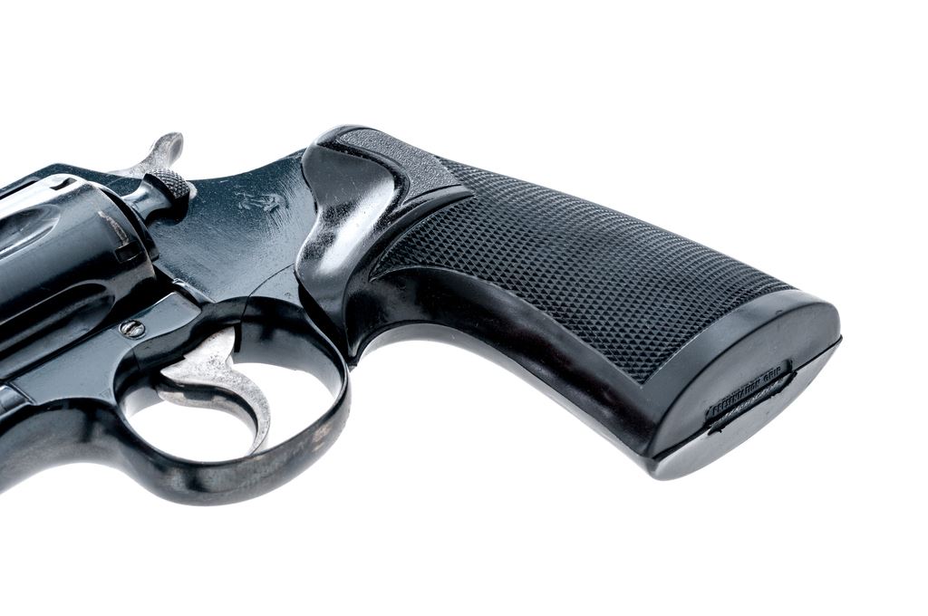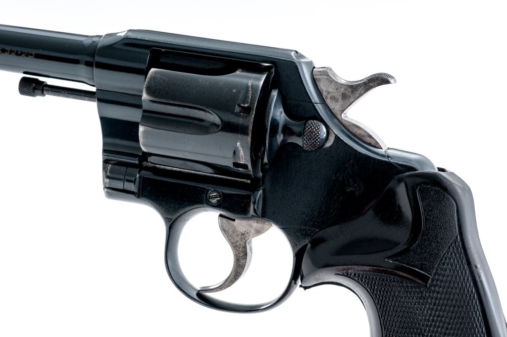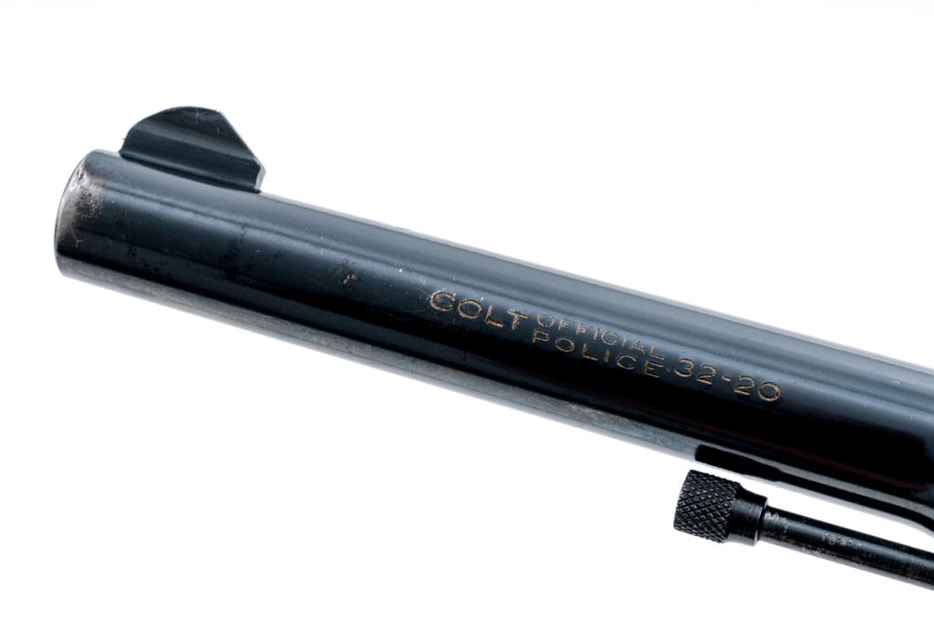 Colt Official Police Double Action Revolver, #403059, .32-20 cal., 5'' barrel, blue finish, Pachmayr rubber grips, machine-turned hammer and trigger. Mfg'd 1954. Condition is near excellent as modified, retaining approx. 90% of a later accomplished immersion blue. Grips are excellent. Action is crisp, bore is fine. Est.: $300-$500. (C&R/PPT)