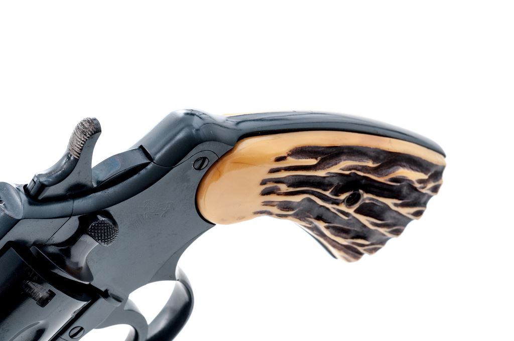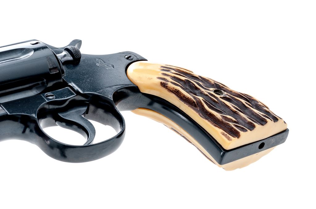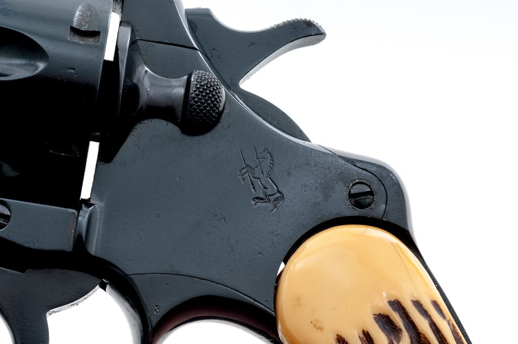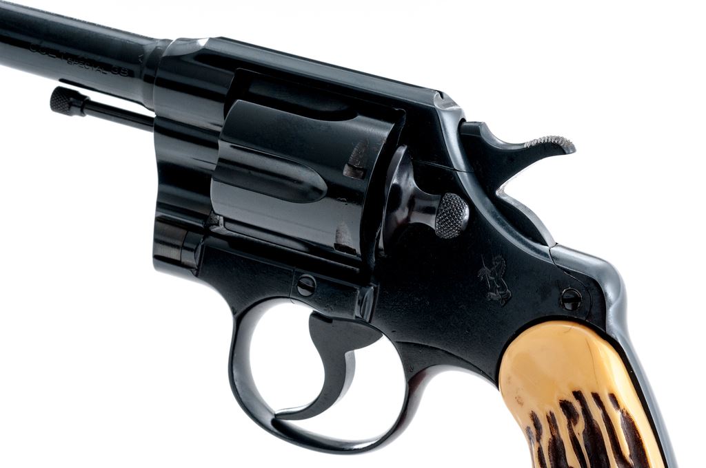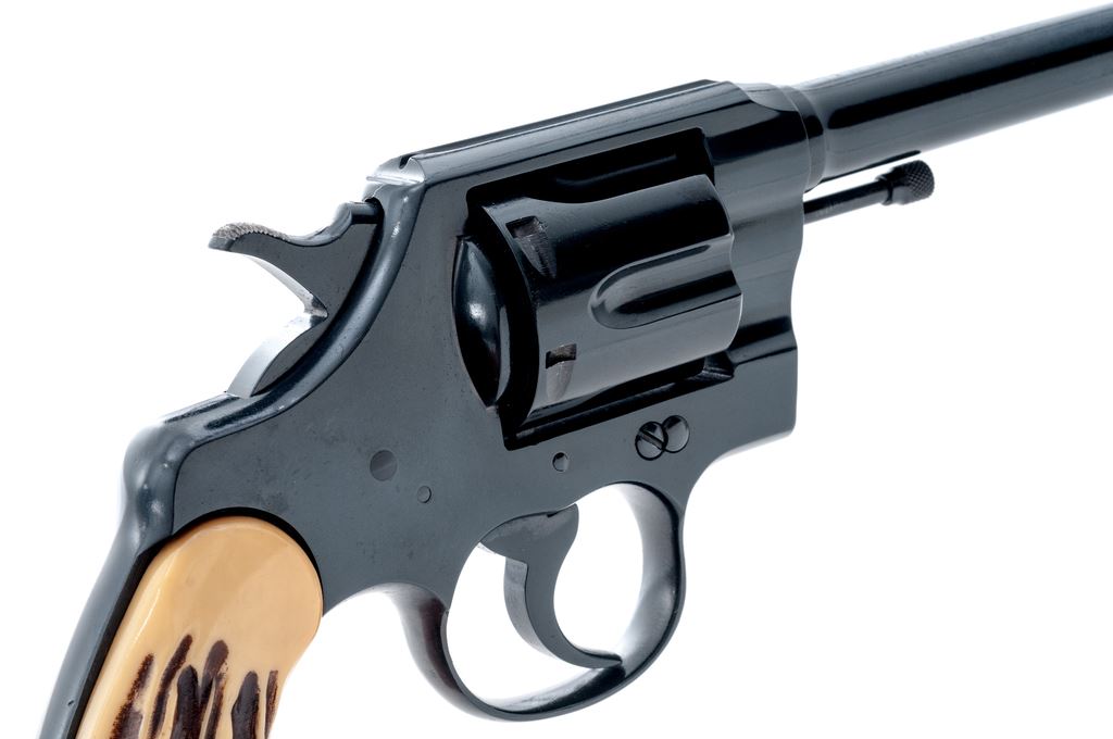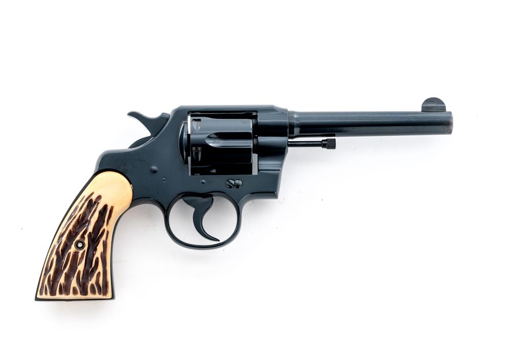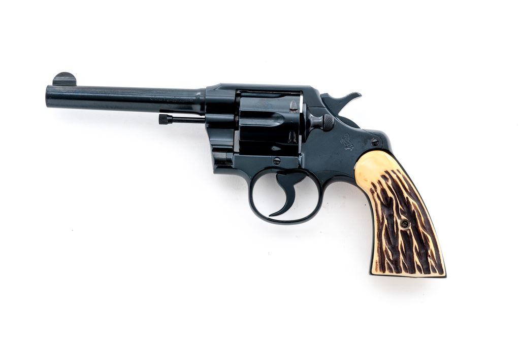 Colt Army Special Double Action Revolver, #450691, .38 Spec. cal., 5'' barrel, blue finish, faux stag grips. Mfg'd 1920. Condition is fine as refinished. Grips are good; lanyard loop has been removed. Good action, fine bore. Est.: $250-$400. (C&R/PPT)