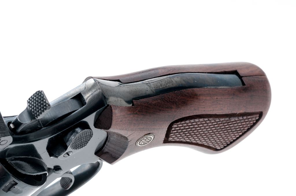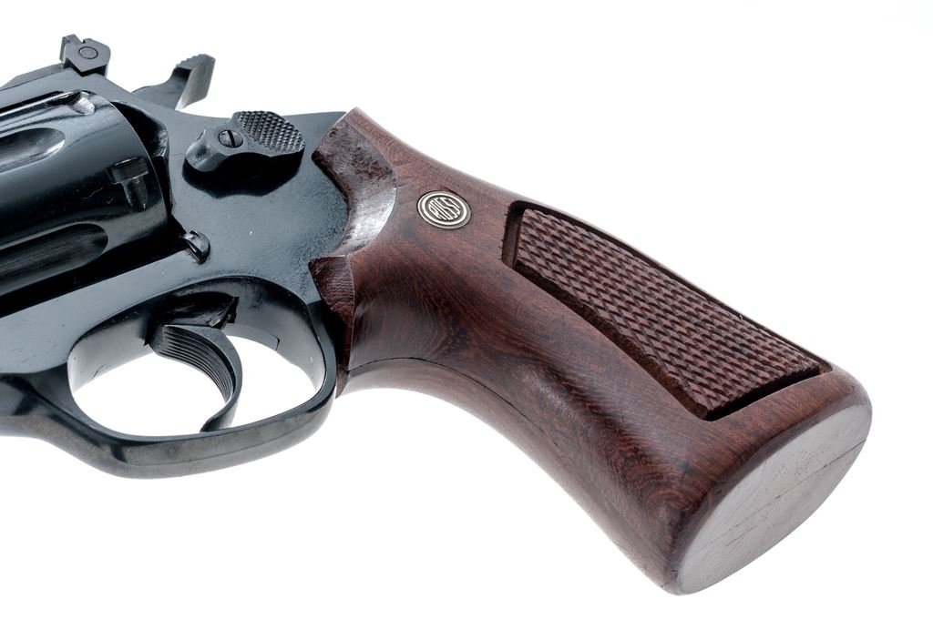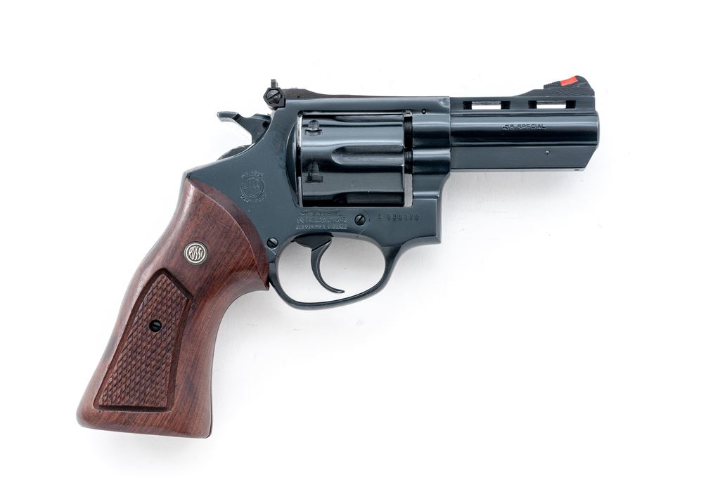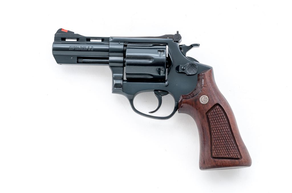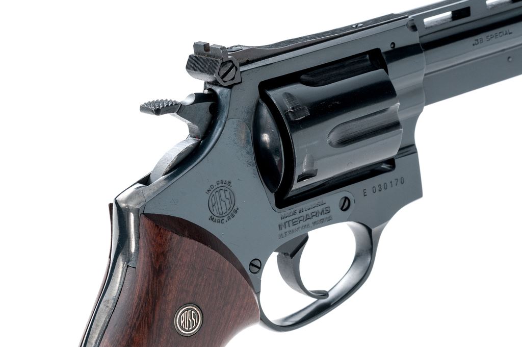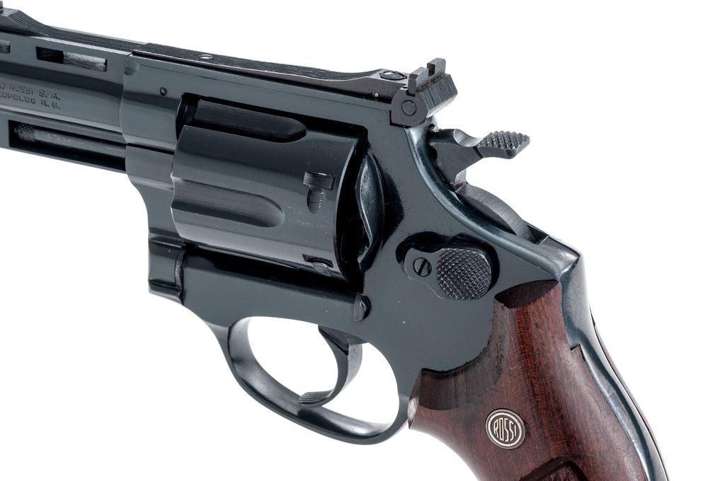 Rossi Double Action Revolver, #E030170, .38 Spec. cal., 6-shot, 3'' vent rib barrel, blue finish, factory checkered wood grips with Rossi medallions, red ramp front sight and square-notched rear sight adjustable for both windage and elevation. Condition overall is excellent, with approx. 98%+ original blue finish, cylinder with only a very light thin index line. Smooth portion of grips with scattered shallow impressions, most noticeable around the Rossi medallions. Factory lettering with crisp raised edges. Excellent action and bright bore. Est.: $200-$300. (Modern/PPT)