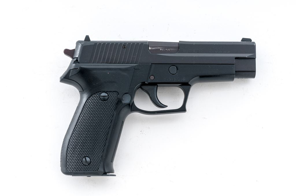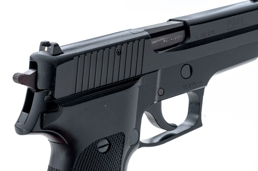 Sig Sauer Model P226 Semi-Automatic Pistol, #U433275, double/single action, 9mm, 4.4'' barrel, matte black slide, black alloy frame, checkered black plastic grips, white dot front sight and square-notched rear sight with white post, and one 15-round Sig Sauer magazine. Condition is excellent, retaining approx. 97% original finish. Lower left edge of the slide with a few tiny impressions. Grips appear near new with only a few insignificant marks from handling. Smooth action, bright bore with excellent rifling. Est.: $500-$700. (Modern/PPT) (High-cap mags not available to Calif. residents.)