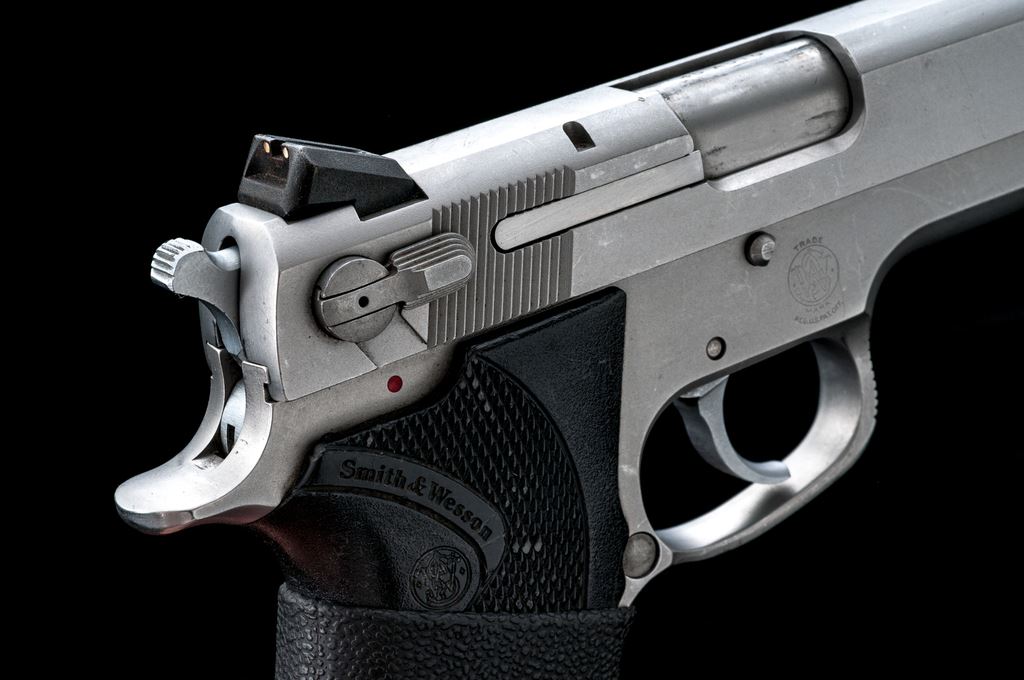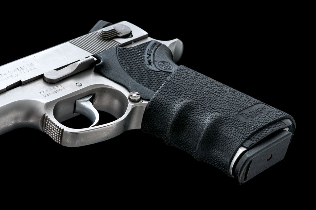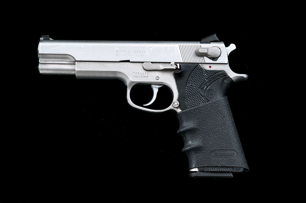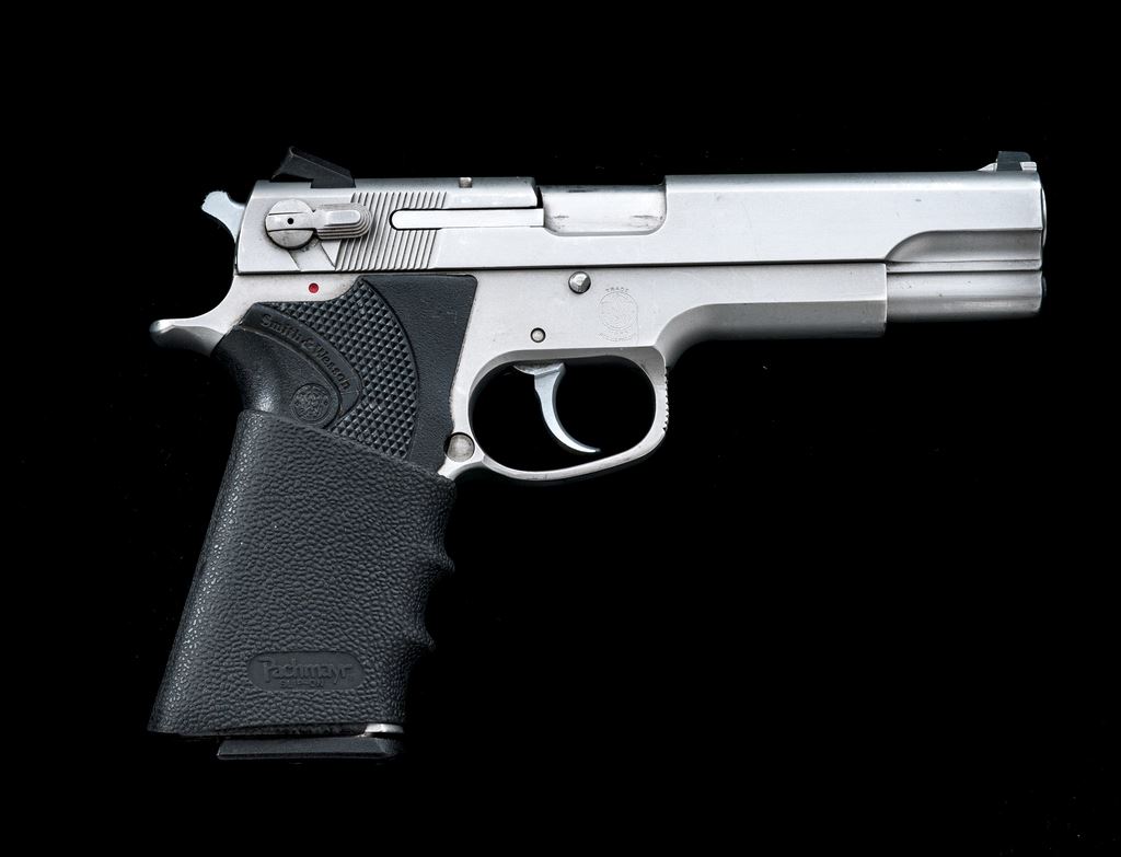 Smith & Wesson Model 4506-1 Semi-Automatic Pistol, #TFP4571, double/single action, .45 ACP cal., 5'' barrel, matte stainless steel, checkered black plastic S&W grips with slip-on black rubber Pachmayr finger-grooved grip cover, white-dot front sight and square-notched white two-dot rear sight, ambidextrous safety/decocking lever, with one 8-round S&W magazine. Condition is very good. Frame and slide with general light surface scuffs and scratches; factory lettering is crisp and clear. Grips with small dings and mars, no chips or cracks, checkering is dirty and needs cleaning. Smooth action, bright bore with excellent defined rifling. Est.: $600-$800. (Modern/PPT)