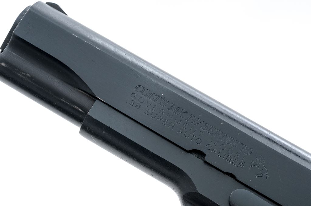 Colt Government Model MK IV Series 70 Semi-Automatic Pistol, #70S45119, .38 Super cal., 5'' MK IV Series 70 marked barrel, blue finish, checkered wood grips with gold Colt medallions, standard sights, and one factory Colt .38 Super magazine. Pistol with standard markings. Mfg'd in 1981. Condition is about fine retaining approx. 97% original finish. Slide and frame with scattered small surface scuffs and scratches, with the highest concentration being along the top of the slide. Factory lettering is clear and defined. Grips with a few moderate impressions, checkering is otherwise sharp with clean gold Colt medallions. Smooth action, bright bore rates excellent. A fine shooter grade pistol in the desirable .38 Super caliber. Est.: $800-$1,200. (Modern/PPT)