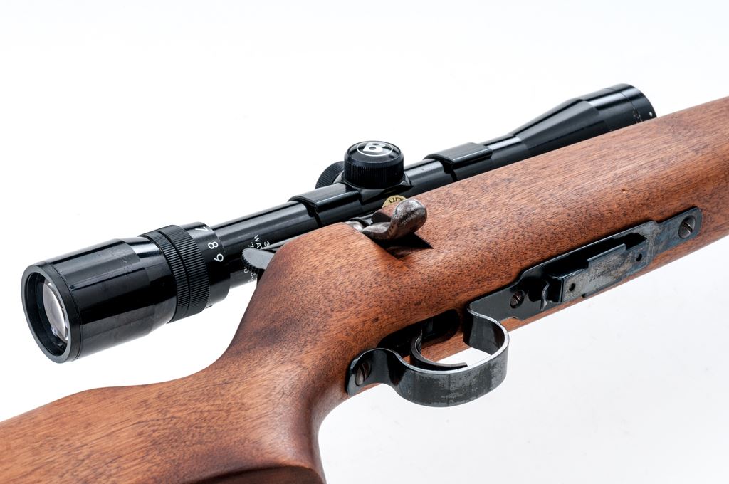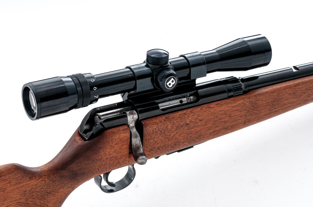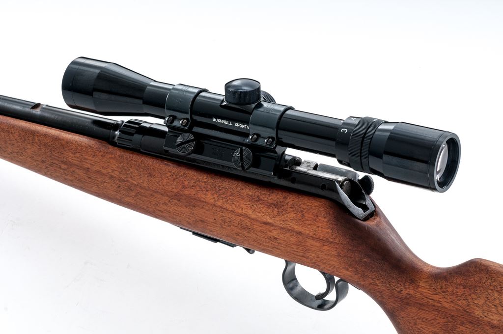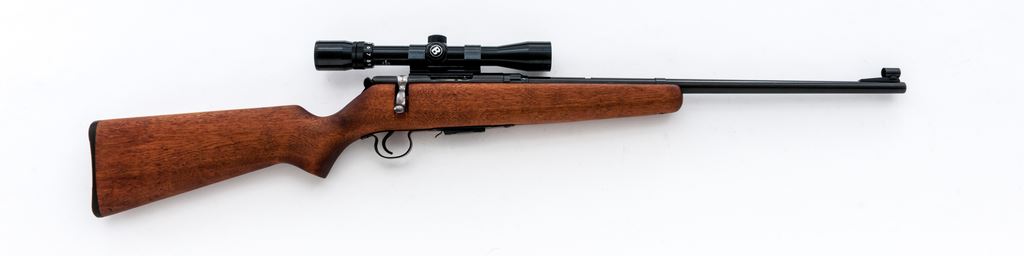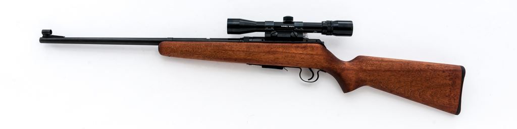Stevens Model 322-A Bolt Action Rifle, NVSN, .22 Hornet cal., 21'' barrel, blue finish. One-piece pistol-grip walnut stock with grooved black plastic buttplate, hooded brass bead blade front sight, rear sight has been removed. Left rear of receiver is drilled and tapped for a sight, missing plug screws. Included is one original magazine. Topped with a Bushnell Sportview 3-9x32 scope on Weaver 1'' side mount and rings; scope with duplex reticle, 1'' tube, and gloss black finish. Condition overall is very good. Approx. 97% blue finish remains with specks of general light oxidation, predominantly on the barrel; triggerguard has been reblued over light pitting. Bolt handle with spots of moderate oxidation. Stock is sound with a small amount of shallow handling marks. Excellent action and bore. Windage bell with a few spots of finish loss to the underside, scope is otherwise excellent with clear optics. Est.: $200-$300. (C&R)