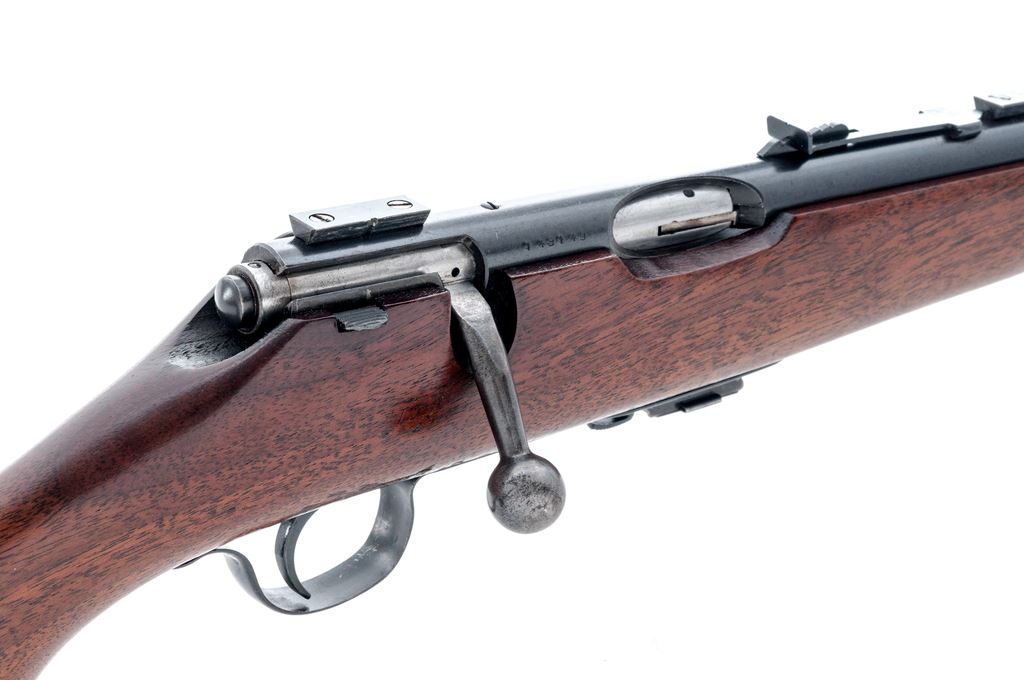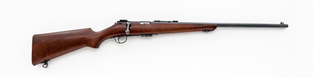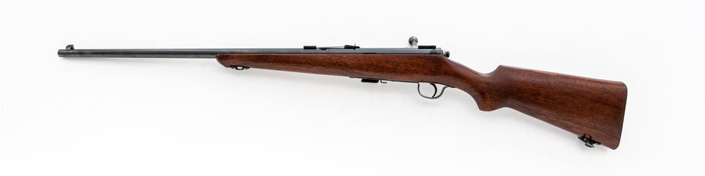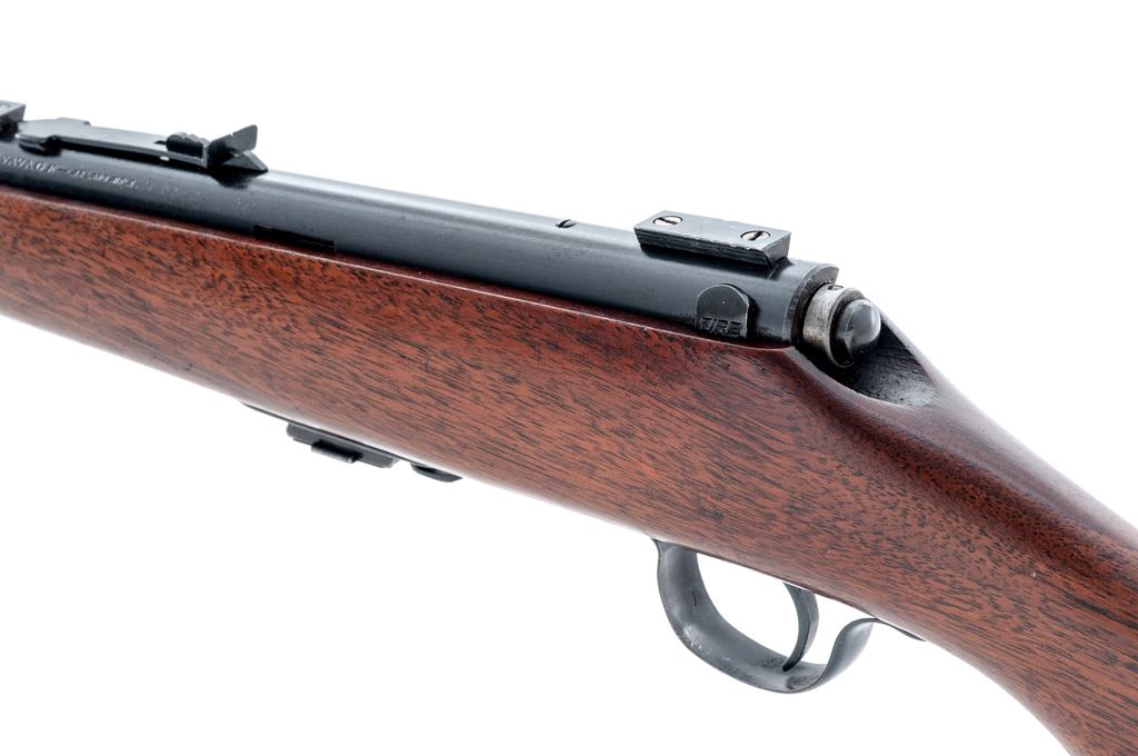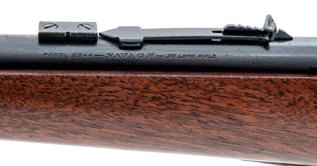 Savage Model 23AA Bolt Action Rifle, #143149, .22 LR cal., 23.25'' barrel, blue finish, one-piece pistol-grip walnut stock, grooved steel ''SVG'' marked buttplate, sling swivels. Sights include a dovetailed blade front sight with silver bead and notched rear sight with elevator, with two dovetail scope blocks. Included is one factory magazine. Condition is very good with approx. 95% toning blue finish; metal with scattered tiny spots of surface freckling. Stock with normal small handling marks, as well as a few larger impressions to right side near triggerguard; bottom edge of buttstock with two small holes from previous sling swivels. Good action with a bright bore. Est.: $150-$250. (C&R)