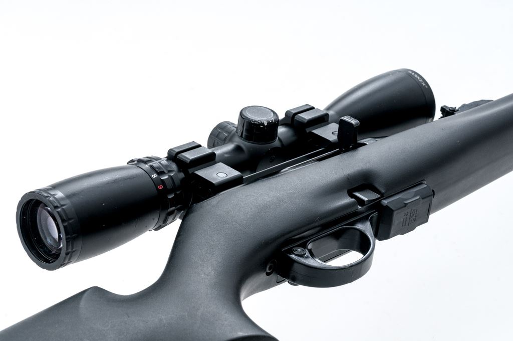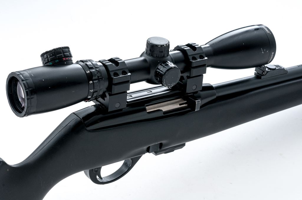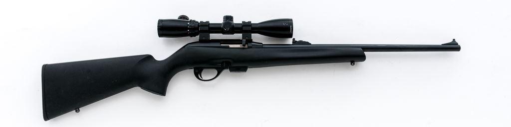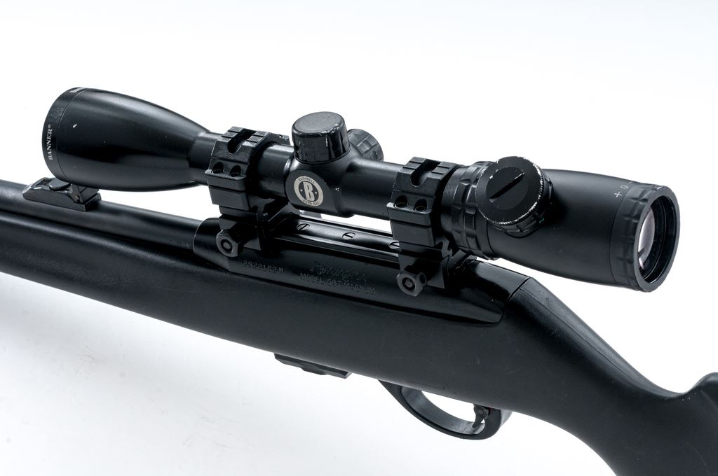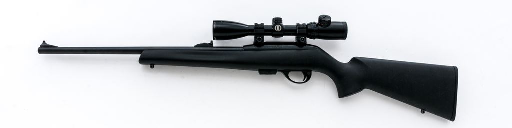 Remington Model 597 Magnum Semi-Automatic Rifle, #2922162M, .22 Win. mag. cal., 20'' matte barrel, black receiver, pistol-grip black synthetic stock, Remington factory checkered hard plastic buttplate, sling swivel studs, blade front sight with silver bead and adjustable ramped rear sight, with one factory magazine. Topped with a Bushnell Banner 3-9x40mm scope, unmarked rings; scope with a illuminated red/green CF500 reticle. Approx. 98% original finish remains and metal surfaces rate as fine, with scattered light handling marks and a few tiny specks of oxidation on the barrel. Stock with general shallow surface scuffs and scratches. Smooth action, bright bore with excellent rifling. Scope exterior with small scratches, adjustment knobs with spots of edgewear; optics are bright and clear, illuminated reticle functions properly. Est.: $250-$400. (Modern)