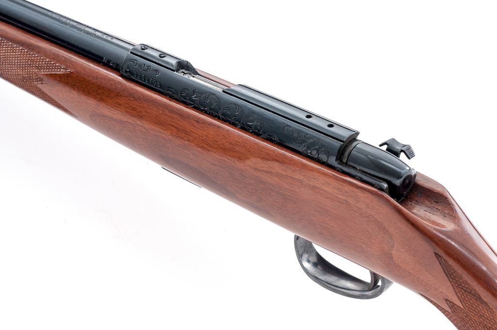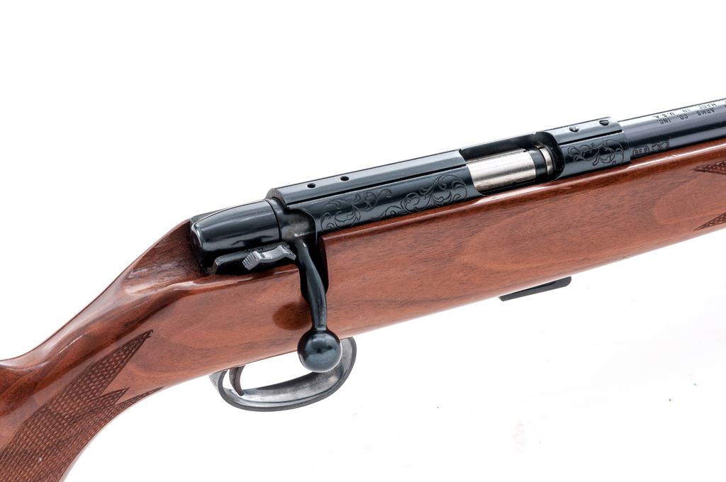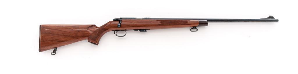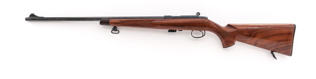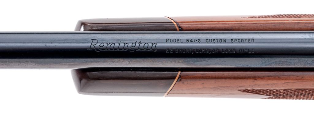 Remington Model 541-S Custom Sporter Bolt Action Rifle, #1231704, .22 S-L-LR cal., 24'' barrel, blue finish, receiver and triggerguard with standard scroll engraving, one-piece pistol-grip walnut stock with point checkering at wrist and forend, rosewood forend cap, Bakelite grip cap and buttplate, with sling swivels. Dovetailed brass bead blade front sight, rear sight has been removed and is missing plug screws; receiver is grooved, factory drilled and tapped, missing rear plug screws, and includes one magazine. Barrel date code is PO (mfg'd 1977). Condition is very good retaining approx. 96% original blue. Bottom of barrel with two spots of concentrated tiny surface nicks and scratches. At top, near one of the rear drilled and tapped holes, there is a small circular spot of finish loss, most likely from a sight that was previously mounted to the factory grooved receiver. Factory lettering and engraving is clear and defined. Stock retains most of its original semi-gloss finish, with scattered shallow scratches and handling marks; checkering is mostly sharp and unmarred, with only a few mild flat spots. Smooth action, bright bore with excellent rifling. Est.: $350-$550. (Modern)