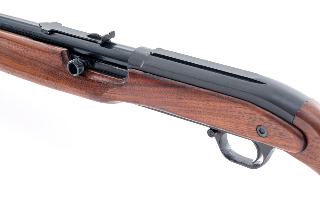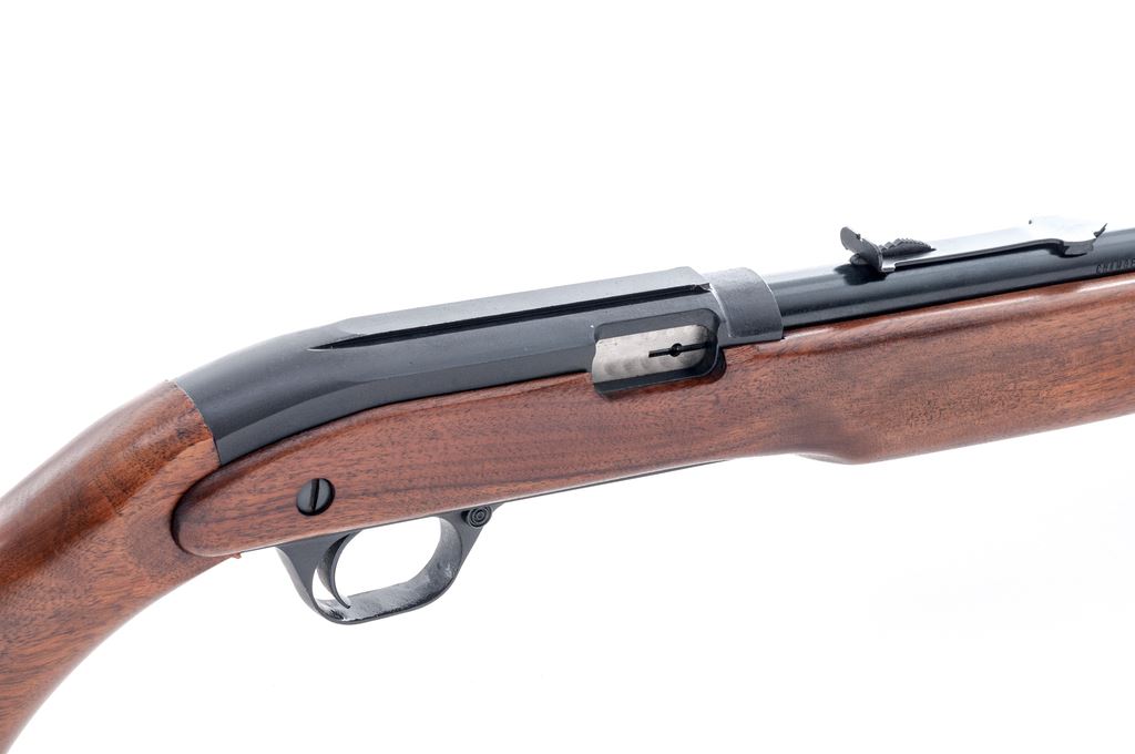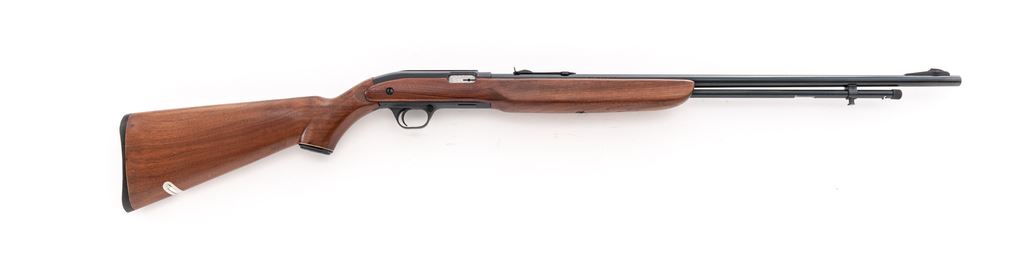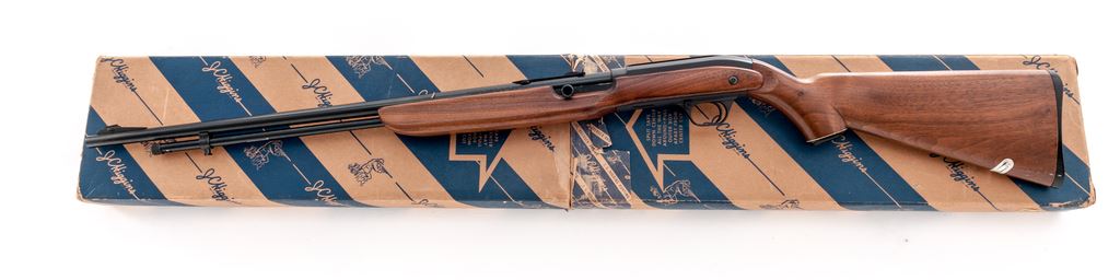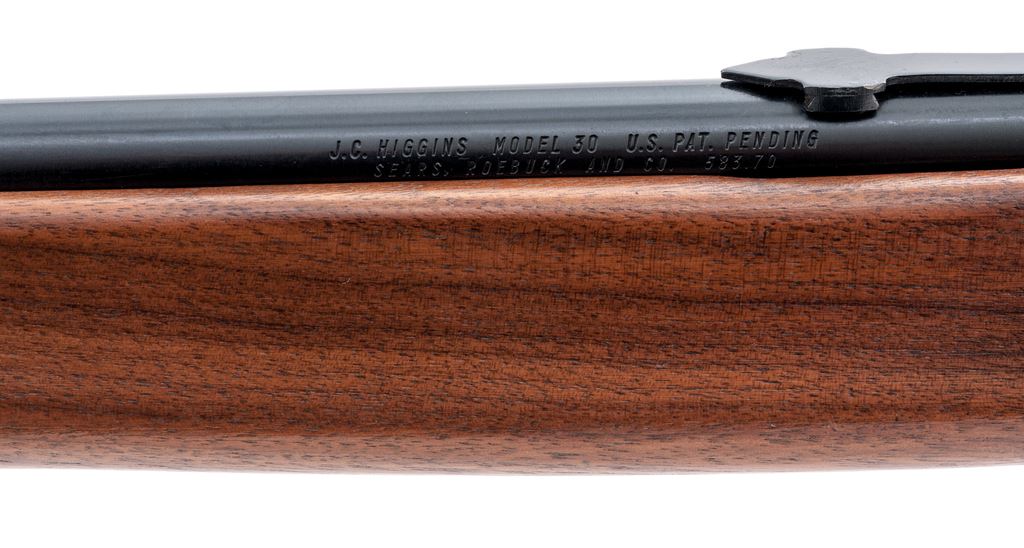 J.C. Higgins Model 30 Semi-Automatic Rifle, with box, NVSN, .22 LR cal., 24'' barrel, blue finish, factory grooved receiver, two-piece pistol-grip walnut stock, black plastic J.C. Higgins buttplate, grip cap, and retractable sling. Sights include a blade front dovetailed into a ramped base and notched rear sight with elevator. In original cardboard box with blue J.C. Higgins lettering and design; approx. 50% of the end label is present. Metal rates as excellent and retains approx. 98%+ original blue; edges of the factory grooved receiver show light wear. Forend with a moderate chip at the ejection port, and the stock is otherwise excellent showing only intermittent light handling marks. Smooth action, bright bore with excellent rifling. Box shows moderate storage type wear. The original shipping label is still attached. Est.: $150-$250. (C&R)