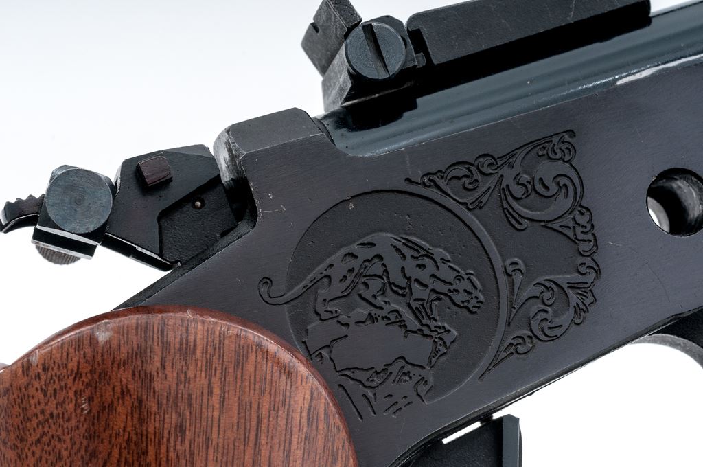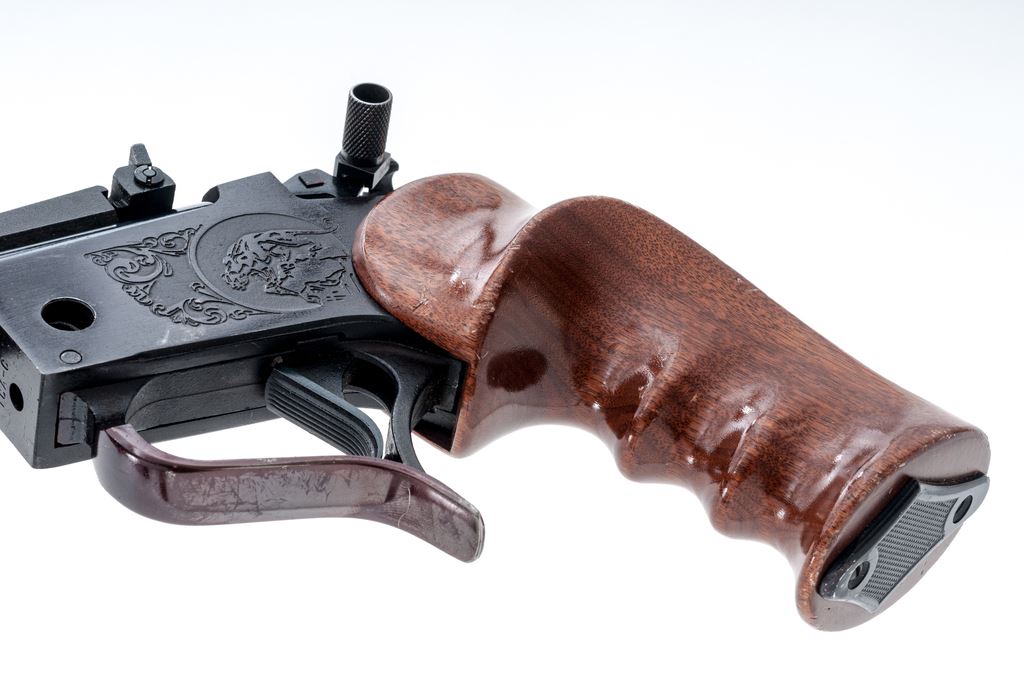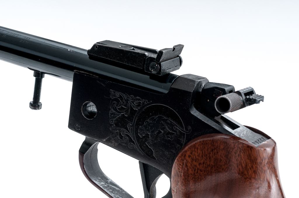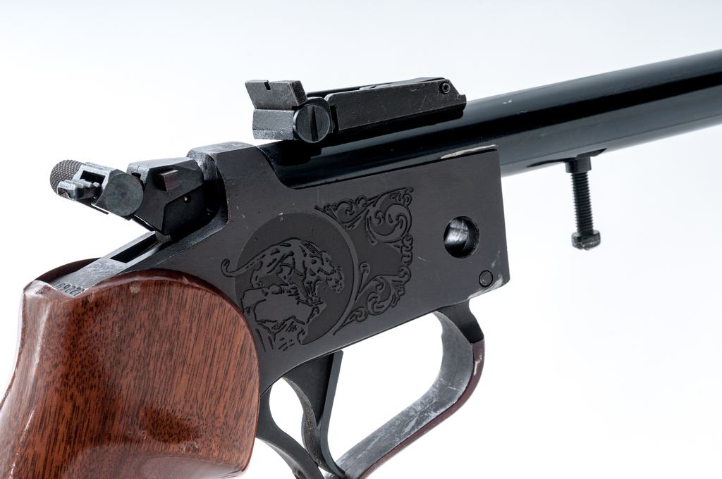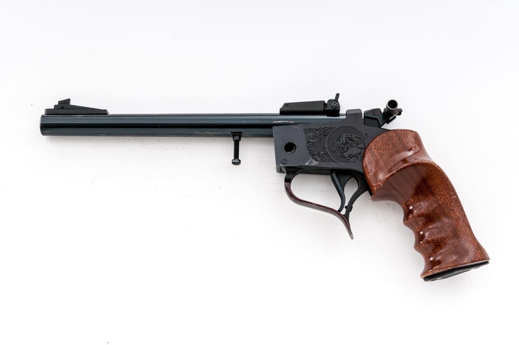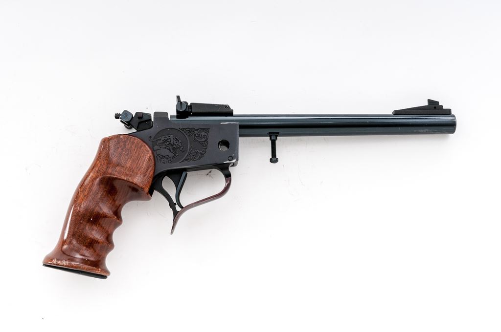 Project Thompson Center Arms Contender Single Shot Pistol, #189227, .223 cal., 10'' barrel, blue finish, plum-colored lever; finger-grooved walnut grip with thumbrest, blade front sight on ramped base and fully adjustable rear sight, with added hammer extension. Missing forend and barrel hinge pin. Condition is good retaining approx. 92% blue finish. Barrel and frame with several small nicks and scratches. Grip with general mostly moderate impressions. Hammer and trigger operate smoothly, bright bore with sharp rifling. Est.: $200-$400. (Modern/PPT)