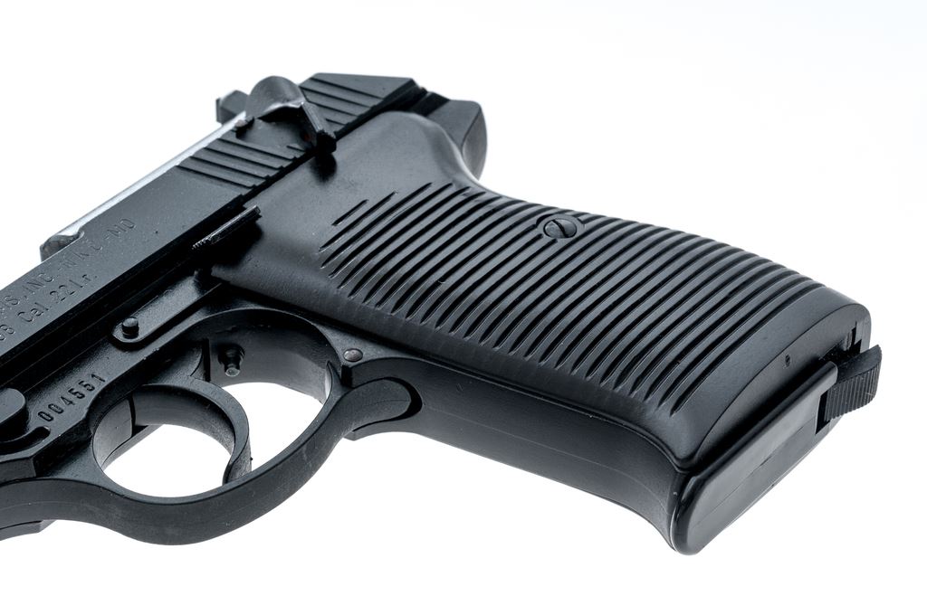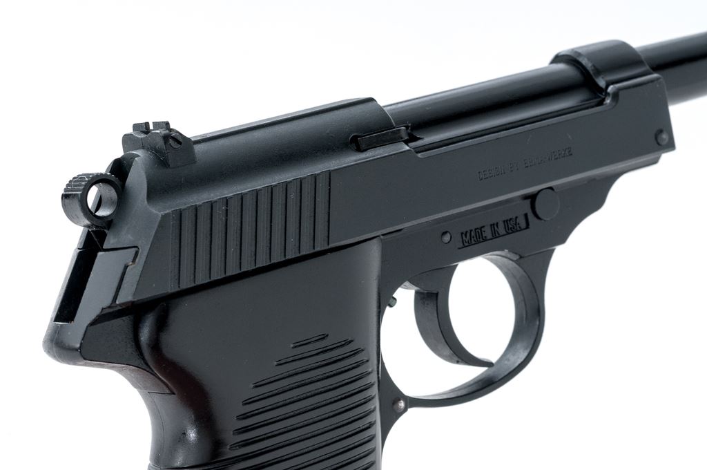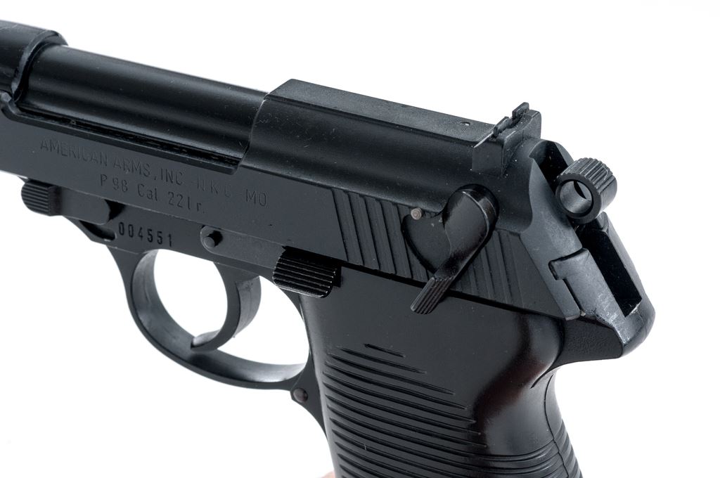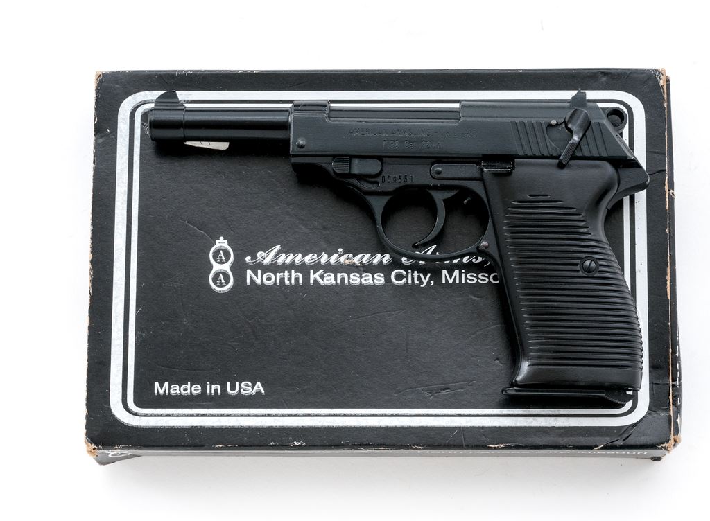 American Arms Inc. Model P98 Semi-Automatic Pistol, #004551, .22 LR cal., 5'' barrel, black finish, grooved black composite grips, standard sights, with one blued steel 8-round magazine. In original two-piece box that is hand numbered to the gun with owner's manual. Designed by Erma-Werke and made in the U.S.A., resembling a P.38 pistol. Approx. 99%+ original black finish remains and pistol rates as excellent overall showing signs of very little handling or use. Box shows moderate storage type wear. Est.: $150-$300. (Modern/PPT)