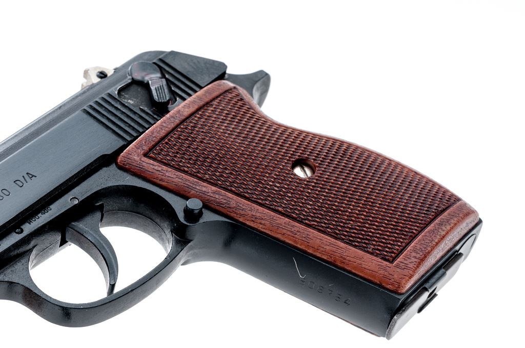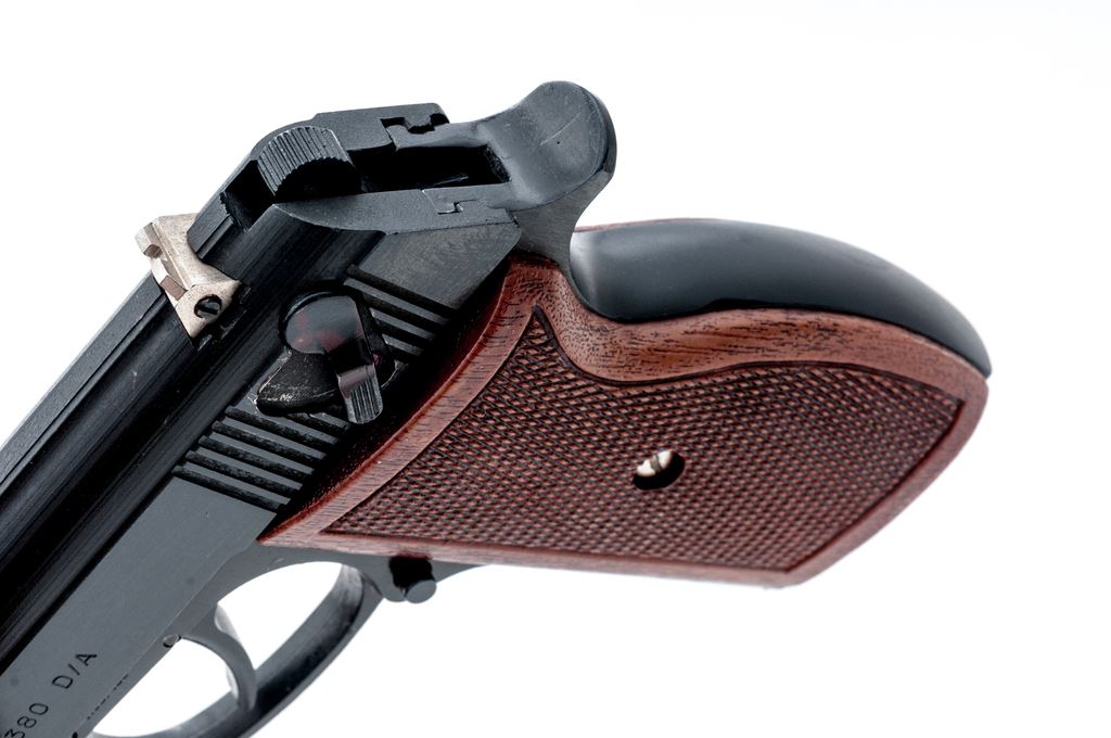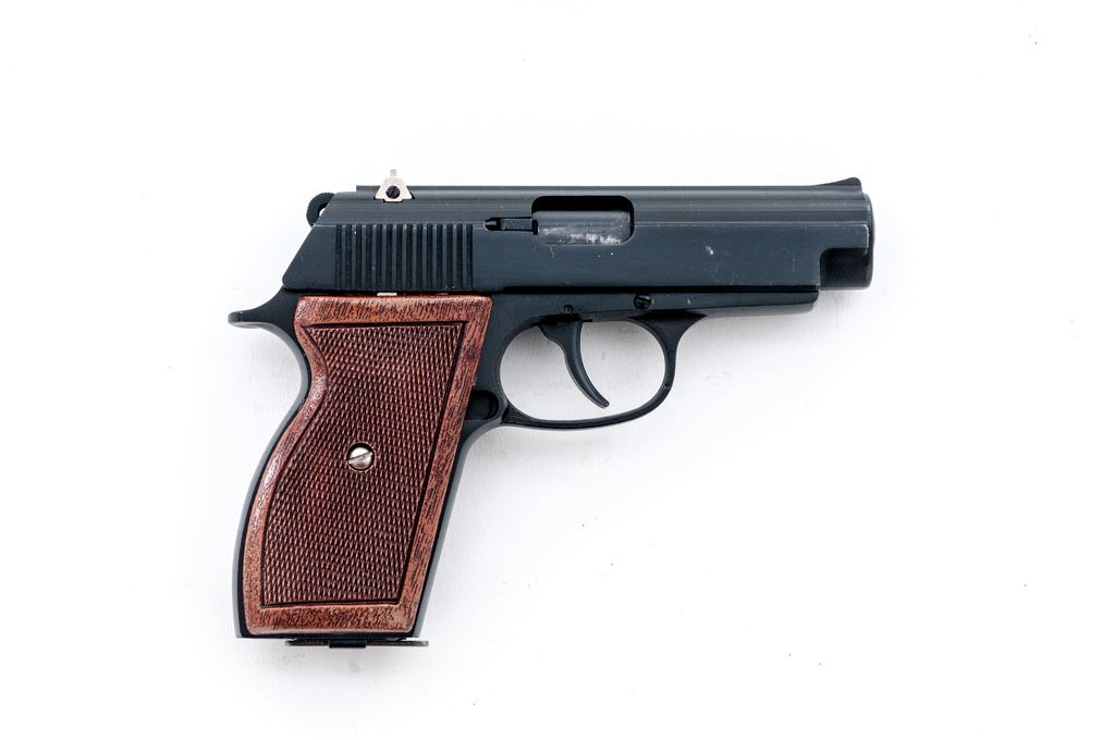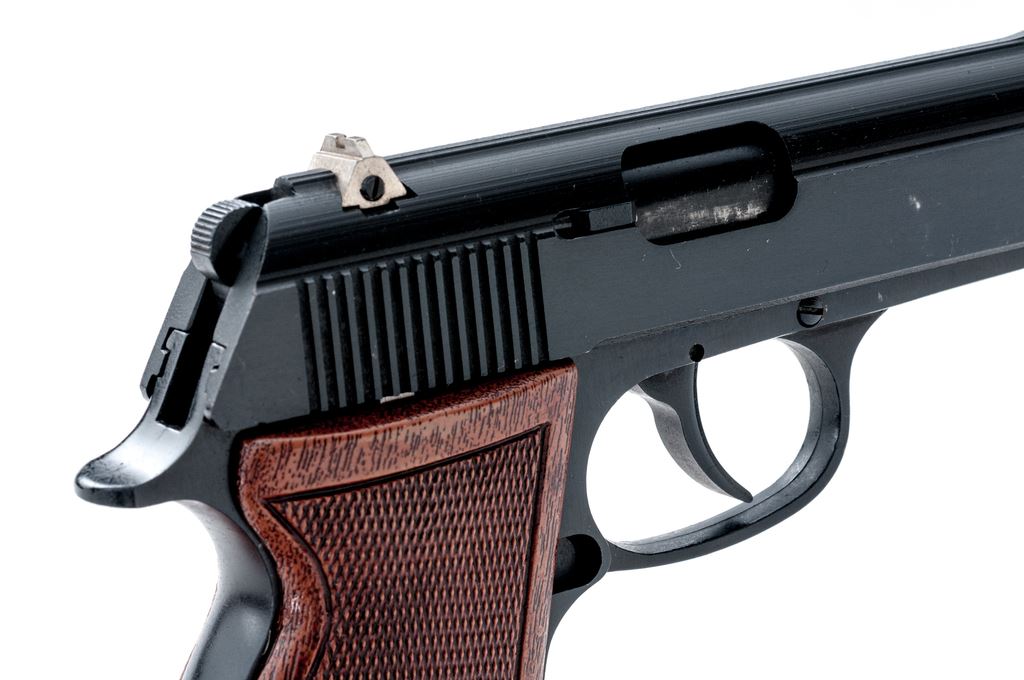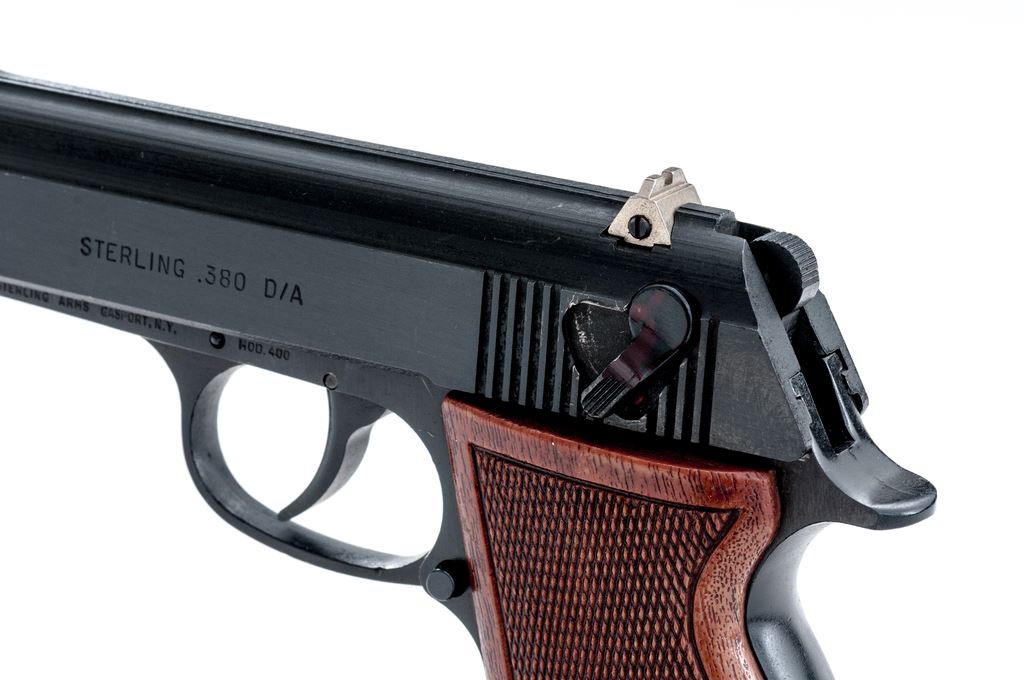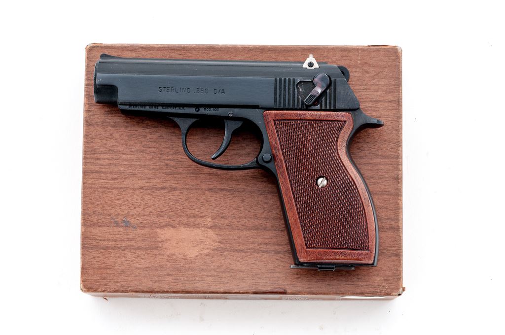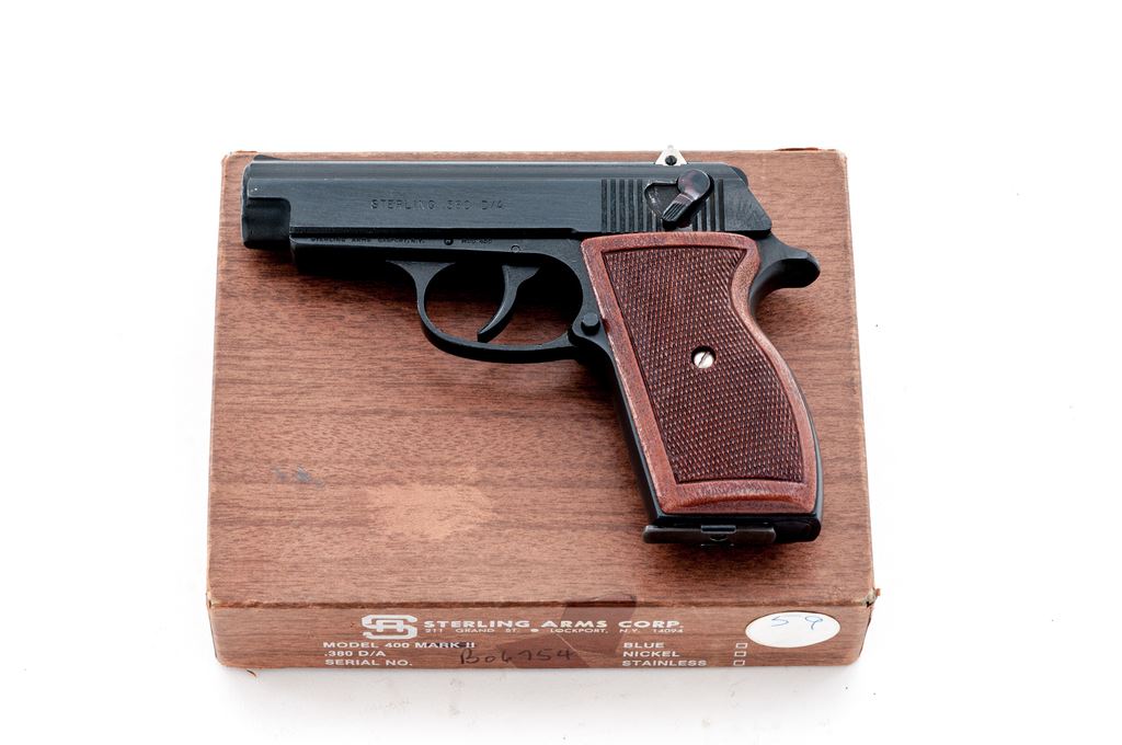 Sterling Arms Model 400 Semi-Automatic Pistol, #B06754, double action, .380 ACP cal., 3.5'' barrel, matte blue frame, matte blue slide with polished blue sides, checkered plastic faux wood grips, integral blade front sight and satin nickel notched rear sight, with one magazine. In two-piece faux woodgrain Model 400 Mark II box that is hand numbered to this pistol, with warranty card/operating instructions. Metal surfaces are in very good+ overall condition with approx. 97%-98% remaining original finish, showing scattered light scuffs and scratches. Grips with a little bit of finish wear around the edges, checkering is excellent. Smooth tight action, excellent bore. Box shows mostly light storage type wear with two of the corners being repaired with clear tape. Est.: $150-$250. (Modern) (Not available to Calif. residents.)