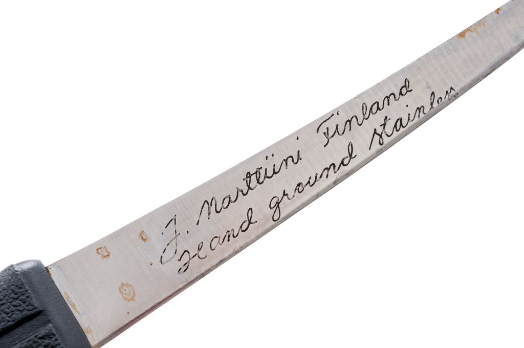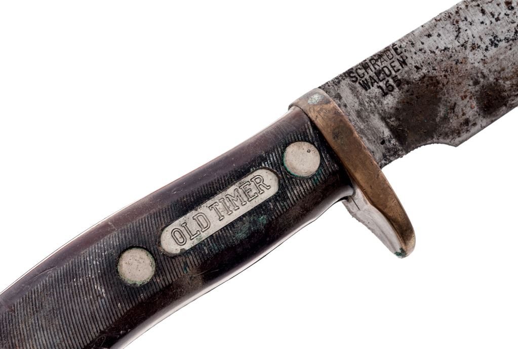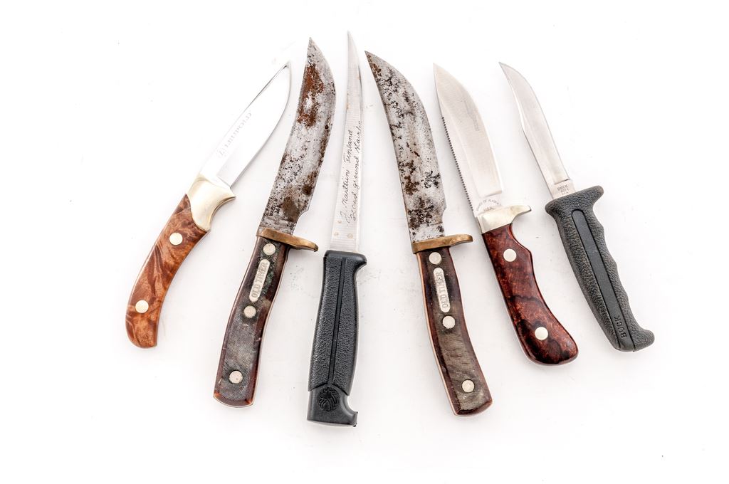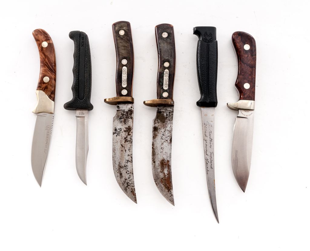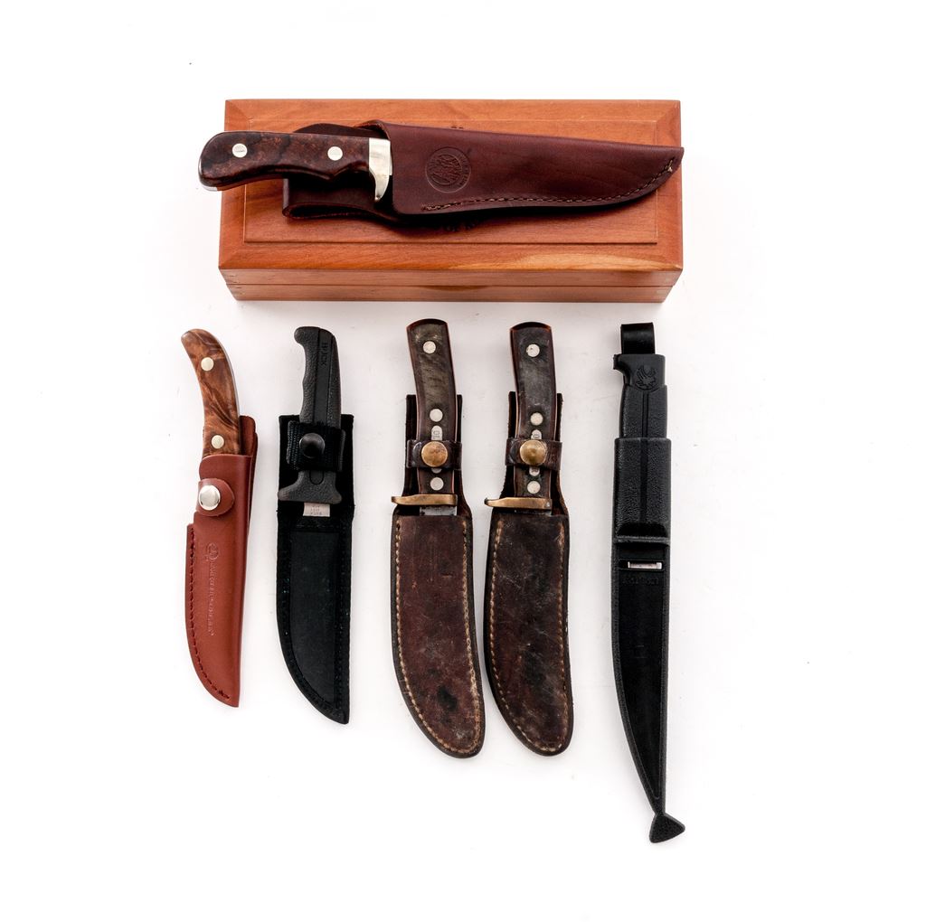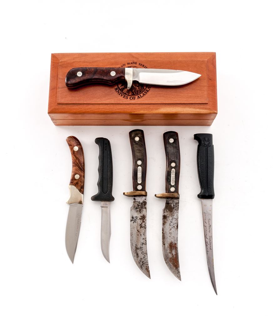 Lot of Six (6) Fixed Blade Knives: 1.) Knives of Alaska Handmade Series Hunting Knife, with wood display box and sheath, HMS #M0233-D, with what looks like desert ironwood handles. Condition is excellent. Blade appears unused. Guard with moderate toning. Sheath appears as new. Wood box with intermittent light storage wear. 2.) Finnish J. Marttiini Falcon Fishing Knife, with plastic sheath, 6'' blade with plastic handle. In very good lightly used condition, blade with some light rust spots that should clean. Sheath is cracked at the throat. 3.) Buck Model 602 Trailmate with black nylon sheath, 3-7/8'' blade, Kraton rubber handle. In very good lightly used condition. 4.) Leupold Cameo with brown leather sheath, 3.75'' blade, smooth wood handles. In near excellent very lightly used condition. Blade with a few light scratches, bolster with mild micro-scratching and toning. Sheath appears as new. 5.) Schrade Walden Old Timer #165 Hunting Knife with brown leather sheath. Condition is fair showing considerable age and wear. Blade is lightly pitted with some surface rust. Knife would improve with a thorough cleaning. 6.) Schrade Walden Old Timer #165 Hunting Knife with brown leather sheath. Condition is fair showing considerable age and wear. Blade is lightly pitted with some surface rust. Knife would improve with a thorough cleaning. Est.: $200-$300/lot.